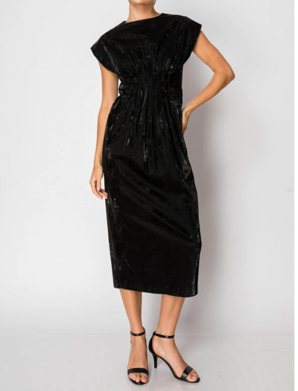 Elevate your style with our Faux Leather Structured Draping Midi Dress. Featuring a structured bodice with intricate draping, this dress creates a defined waistline and adds a touch of elegance to your silhouette. The cap sleeve cut, metal zip at the back, and convenient side pocket make it both fashionable and functional. Made with a blend of 50% PU and 50% polyester, this dress is perfect for any occasion. Model is 5'9.5" and wearing a size small.