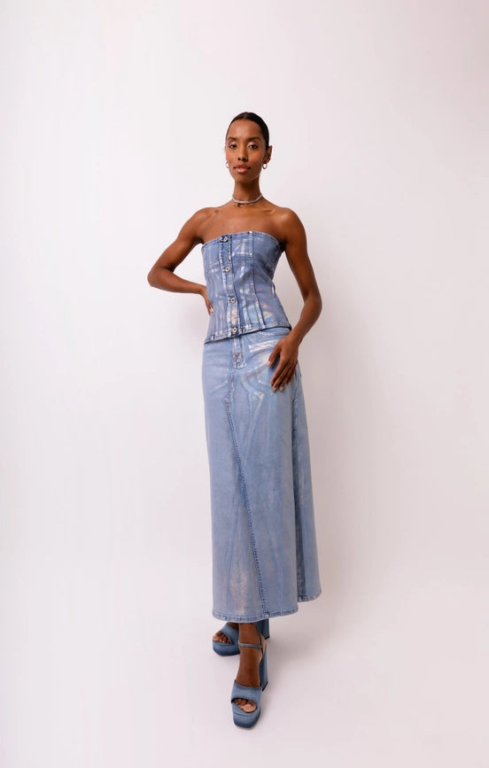 Lupe High Waist Metallic Knee Length Skirt Ice Blue