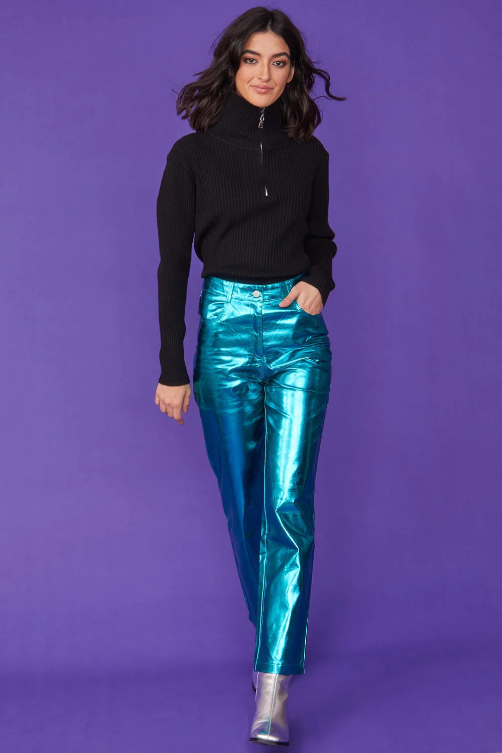 Pink Blue Faux Leather Faux Fur Biker Jacket