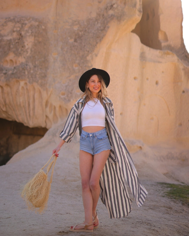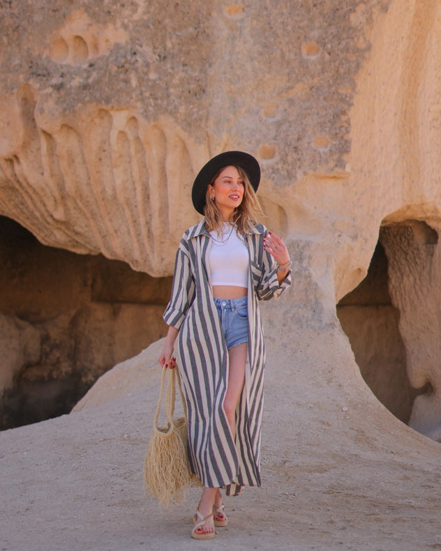 Experience the perfect blend of style and comfort with our Anthracite Striped Long Linen Shirt Dress, expertly crafted from a luxurious blend of 60% linen and 40% cotton. Featuring a front button opening and practical pockets, this dress offers both elegance and functionality. Handmade in Turkey for a flawless finish, it's perfect for any occasion.