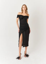 The Audrey Sleeveless Off Shoulder Midi Dress is a timeless piece for any season. Made from a luxurious blend of polyester and elastane, this dress features an elegant off shoulder neckline, front side slit, and ruche detailing for a flattering fit. Perfect for any formal occasion, simply dry clean to keep it looking its best.