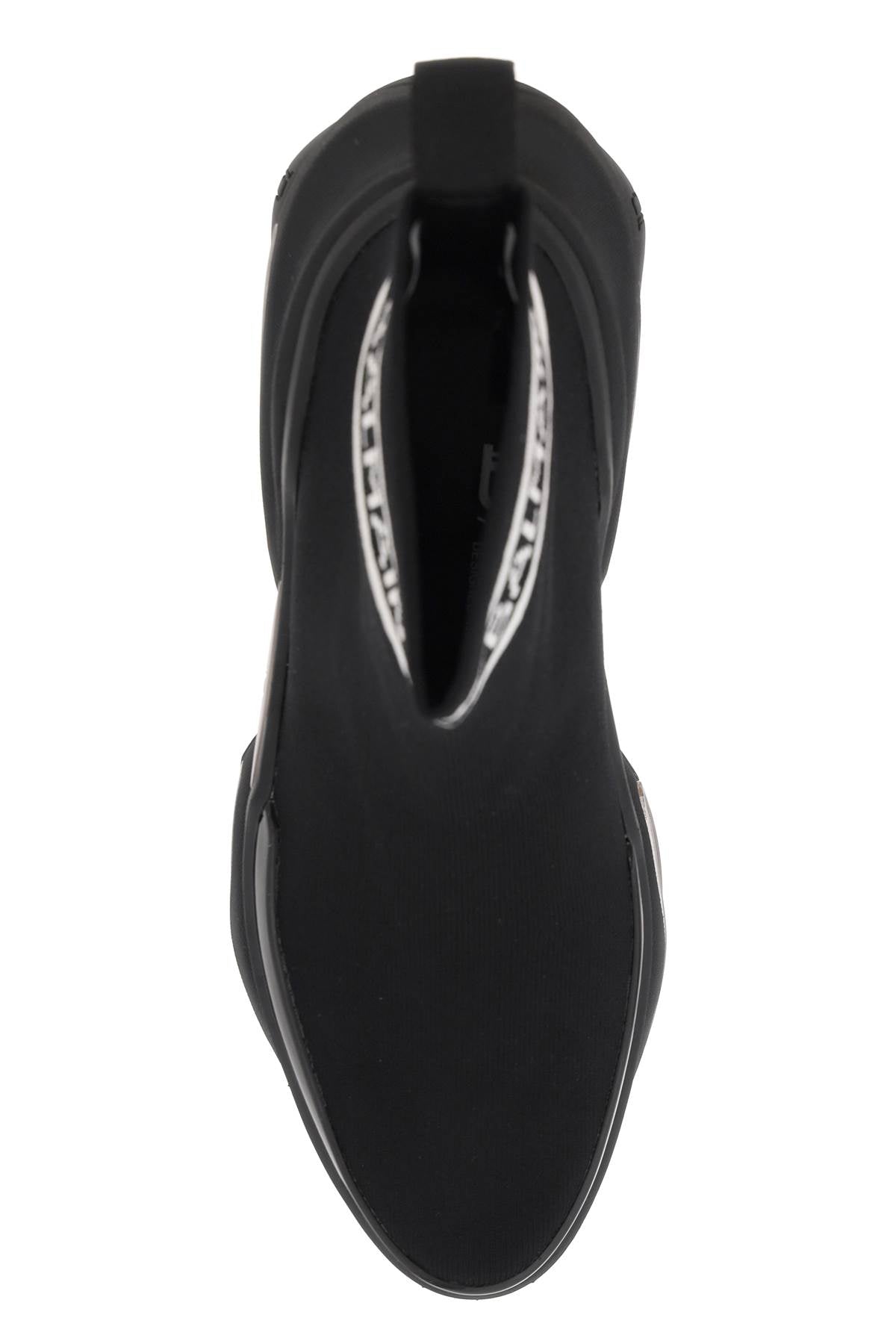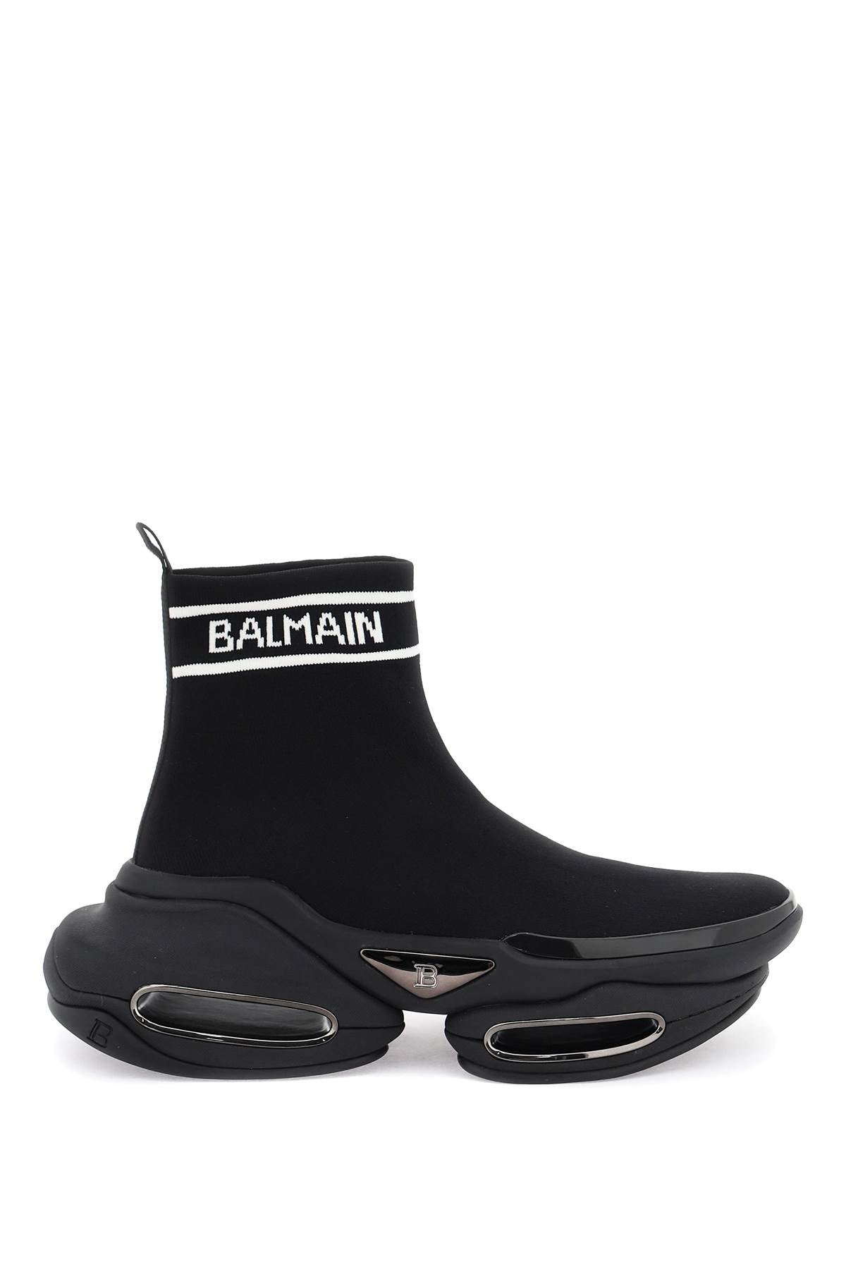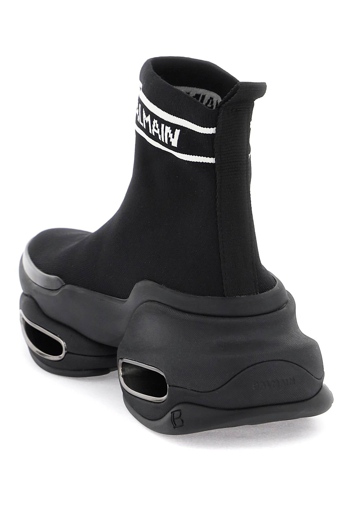 Balmain "B-Bold" sneakers featuring a stretch techno fabric sock-like upper with contrast jacquard lettering logo at the ankles, enriched by an oversized rubber sole with cut-outs finished with metal edges. Rear gros-grain loop-tab, side intarsia with engraved logo. Removable insole and side embossed monogram at hem. Heel Height = 7 cm