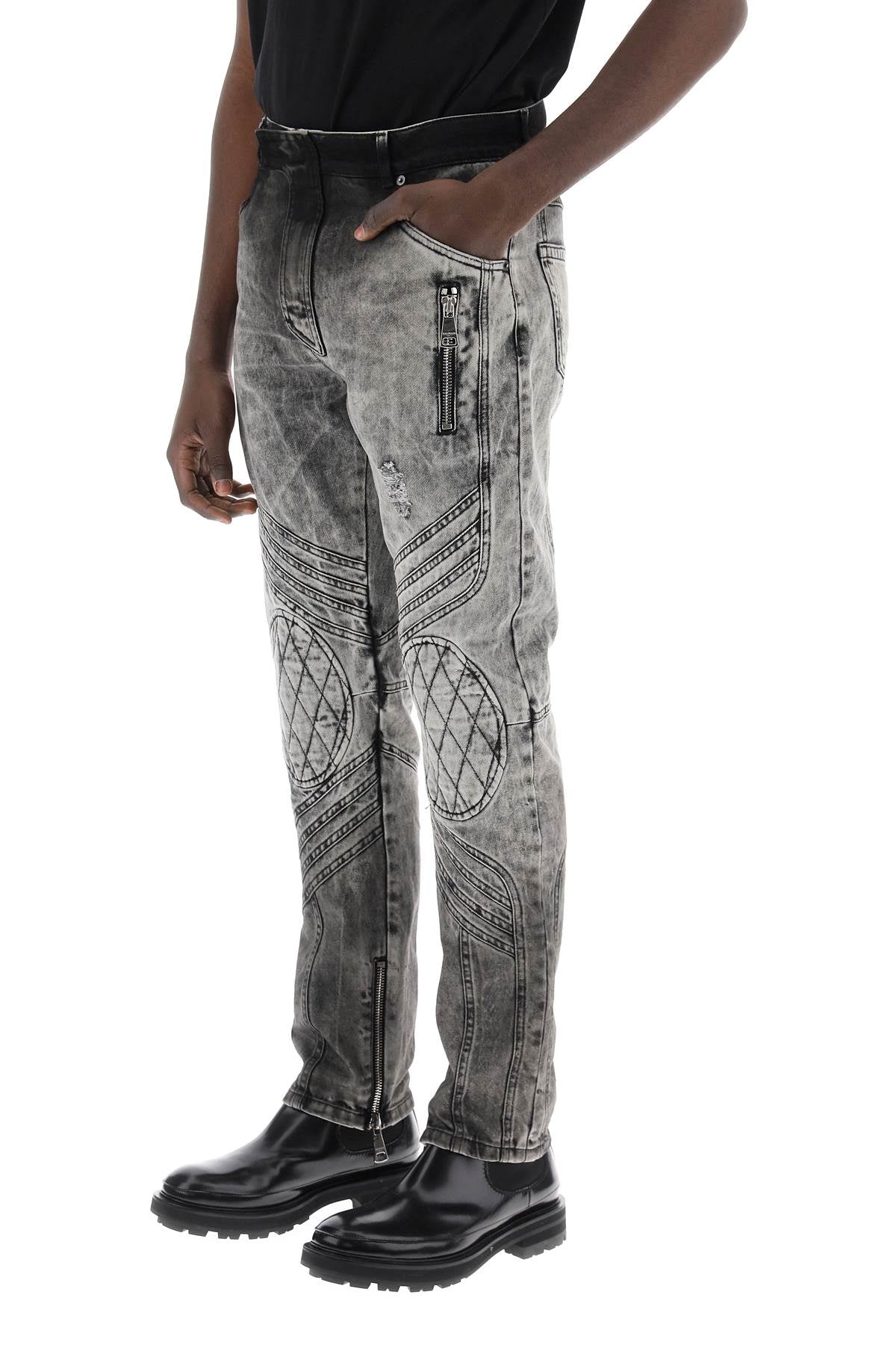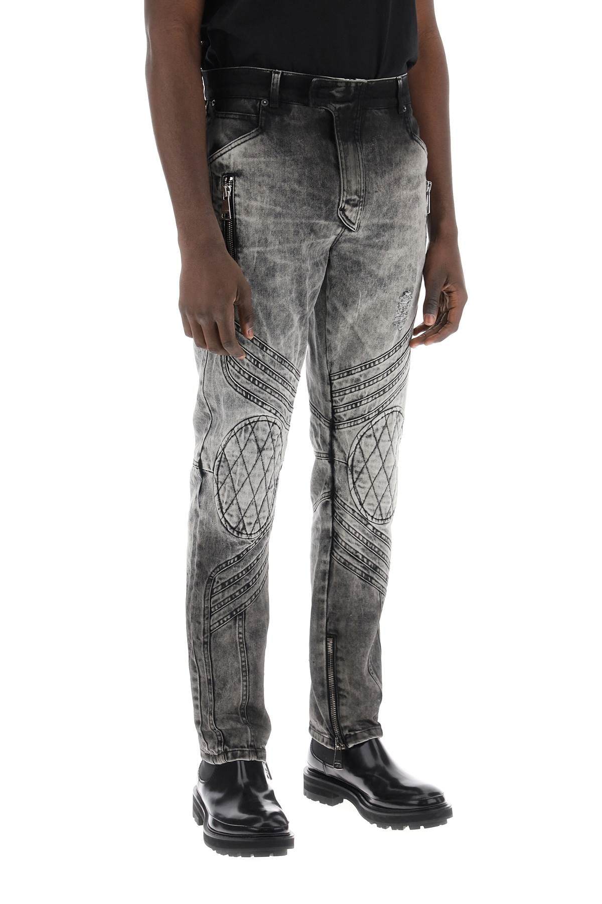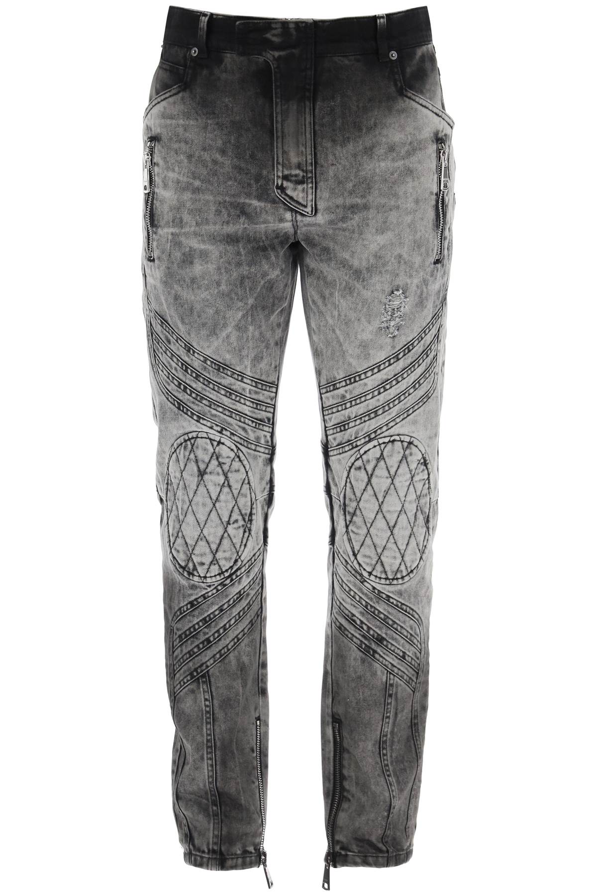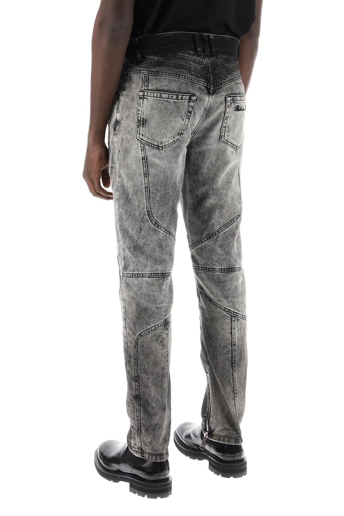 Balmain Motor jeans crafted in faded-effect stone-washed cotton denim, characterized by a biker-inspired five-pocket design, featuring zipper-fly and snap closure, belt loops, zipped welt pockets and hem, topstitched inserts and knee patches. Finished with distressed detailing and Balmain Paris embroidery on the back. Slim fit with tapered cut. The model is 187 cm tall and wears size 31.