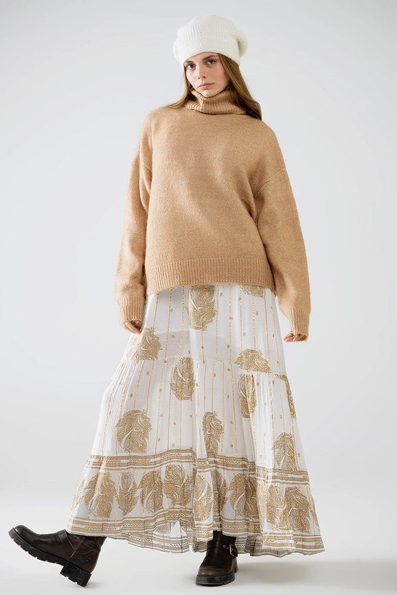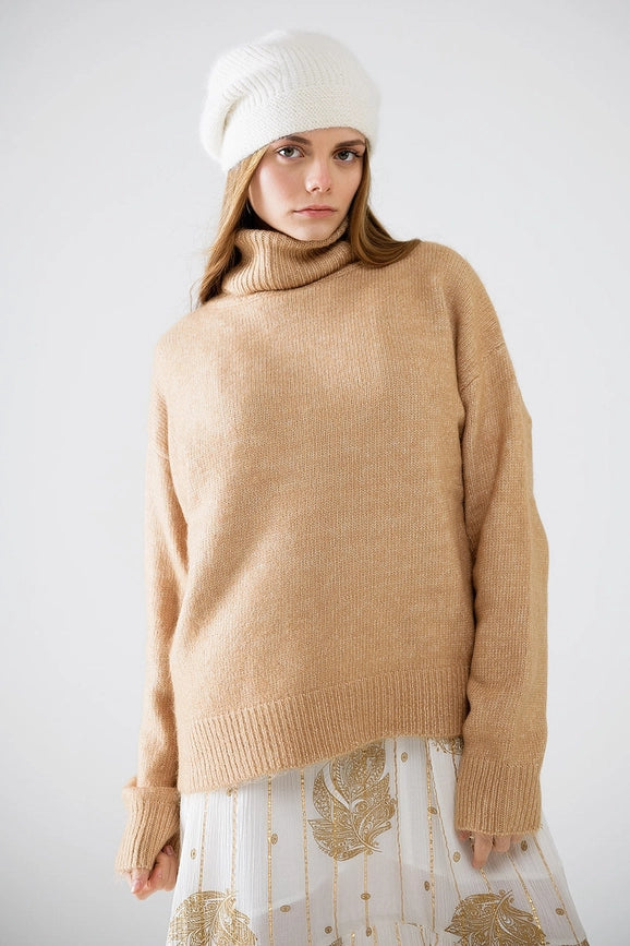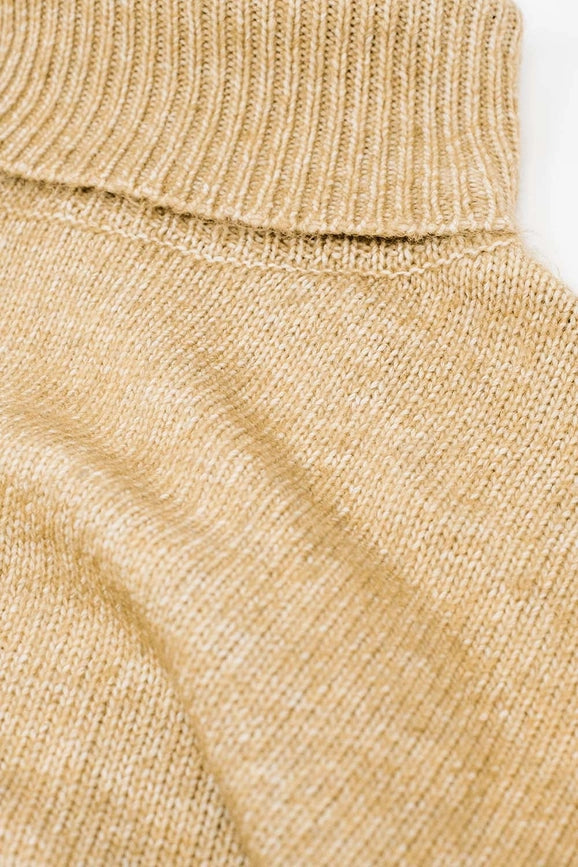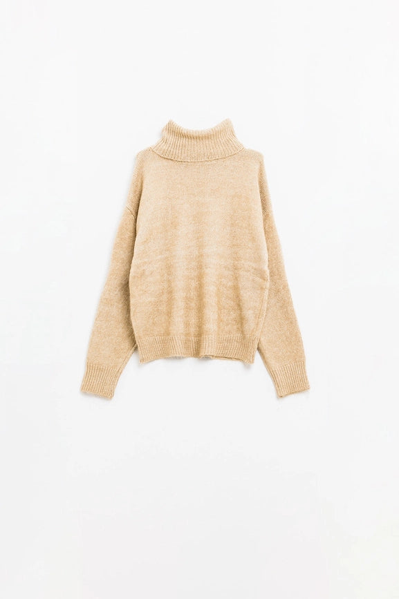 Cozy up in our beige turtleneck jumper, featuring charming dropped sleeves for added style and comfort. The soft, chunky knit fabric keeps you warm and comfortable all day long. Perfect for lounging at home or a casual outing, this jumper is a must-have for the colder months. Get yours now and stay chic and snug!