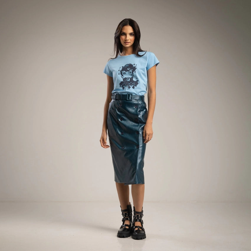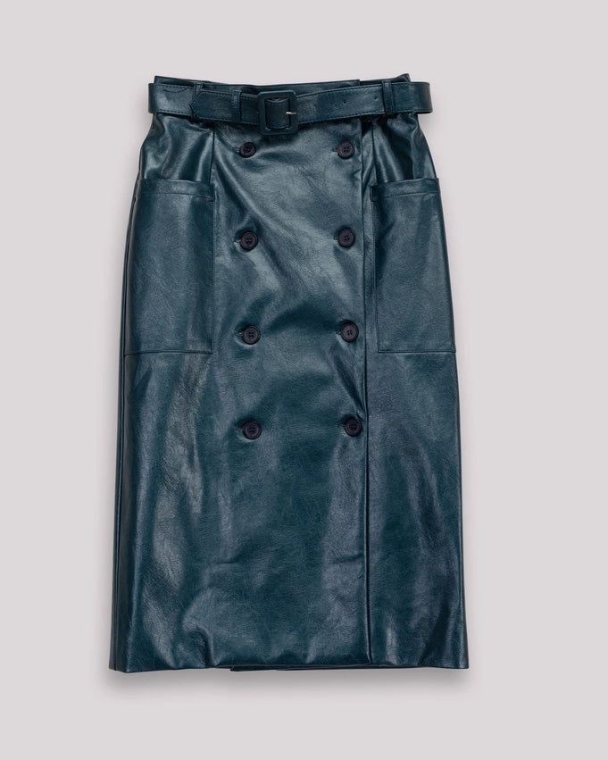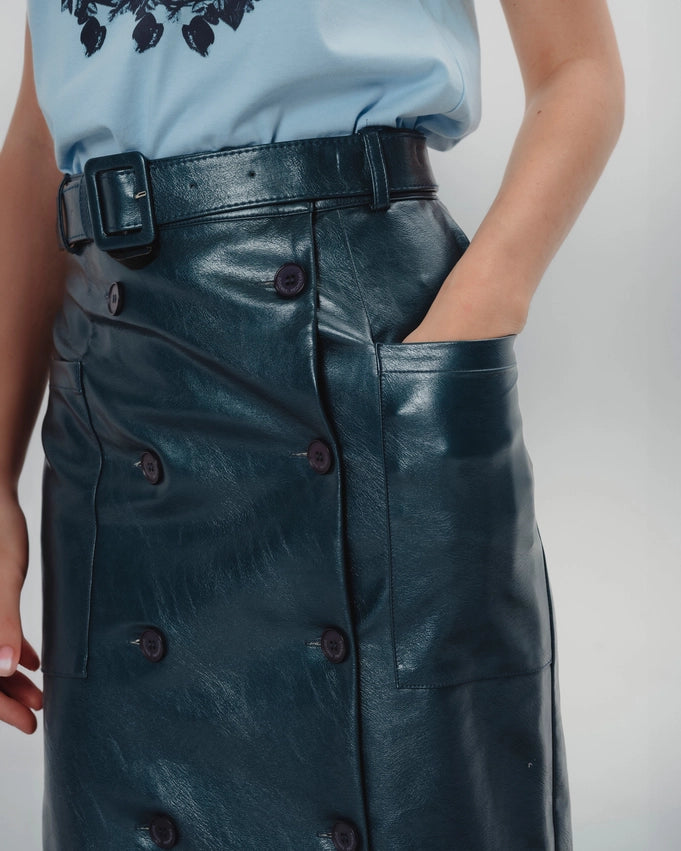 Elevate your autumn wardrobe with the Bella Leather-Effect Midi Skirt. Crafted in Spain, this semi-leather skirt boasts a straight silhouette with cross buttons and a waistband that is made of the same material. With its vibrant blue color, this skirt exudes strength and elegance, making it a must-have piece for the season.