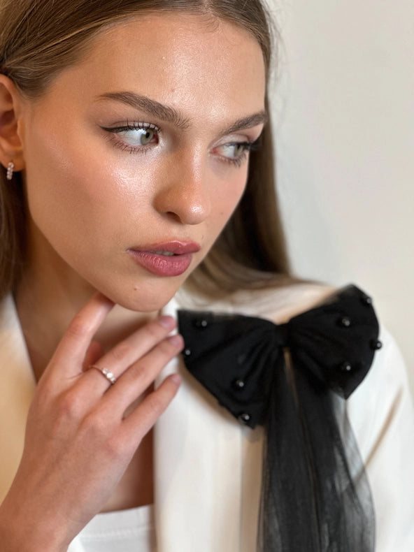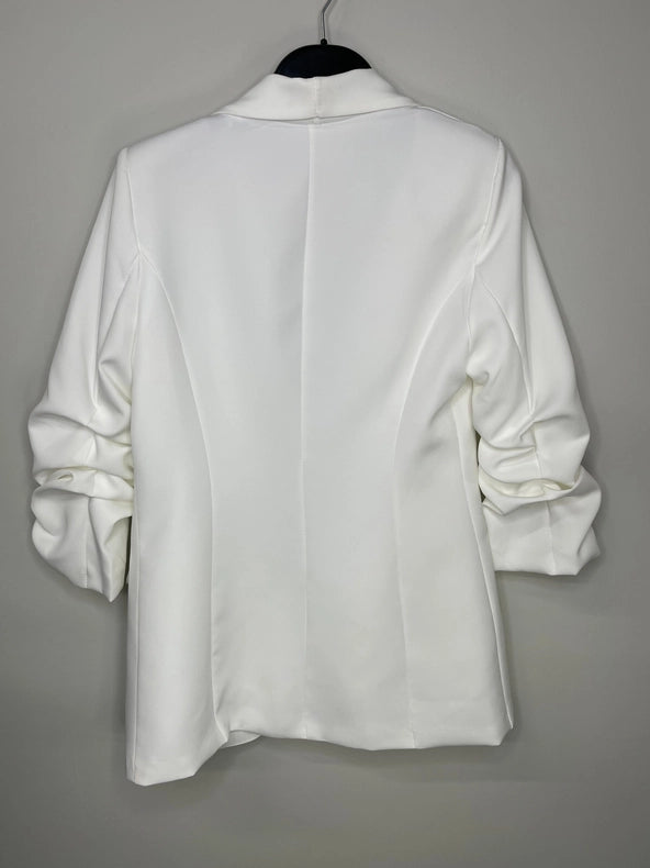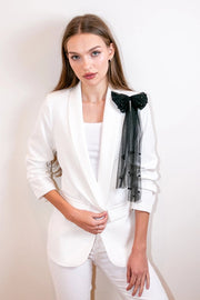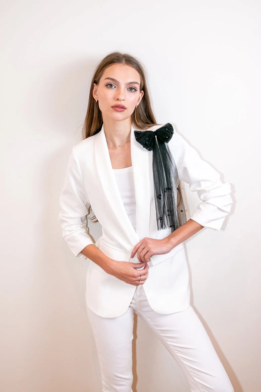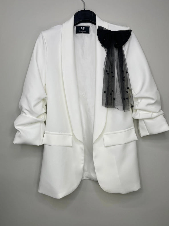Make a statement with our Blazer, Ruched White, Black Long Bow. With a chic and stylish design, this blazer features ruched sleeves and a removable black lace bow for added elegance. Perfect for a night out or any occasion, stand out from the crowd and elevate your outfit with this must-have piece.