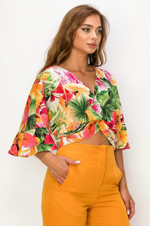 Introducing our "Blooming Grace" Floral Print Crop Top, the perfect blend of femininity and contemporary style. Hand wash only. The cropped length and trendy bell sleeves add a touch of youthful playfulness, while the v-neckline exudes sophistication. Elevate your wardrobe with this charming top.