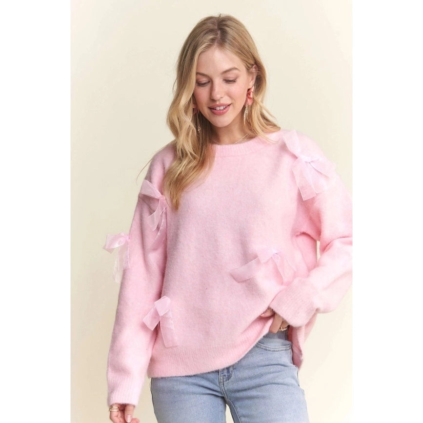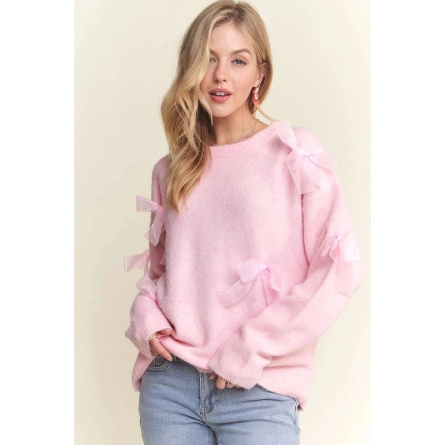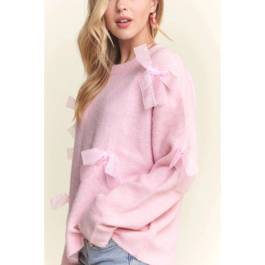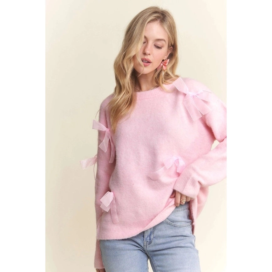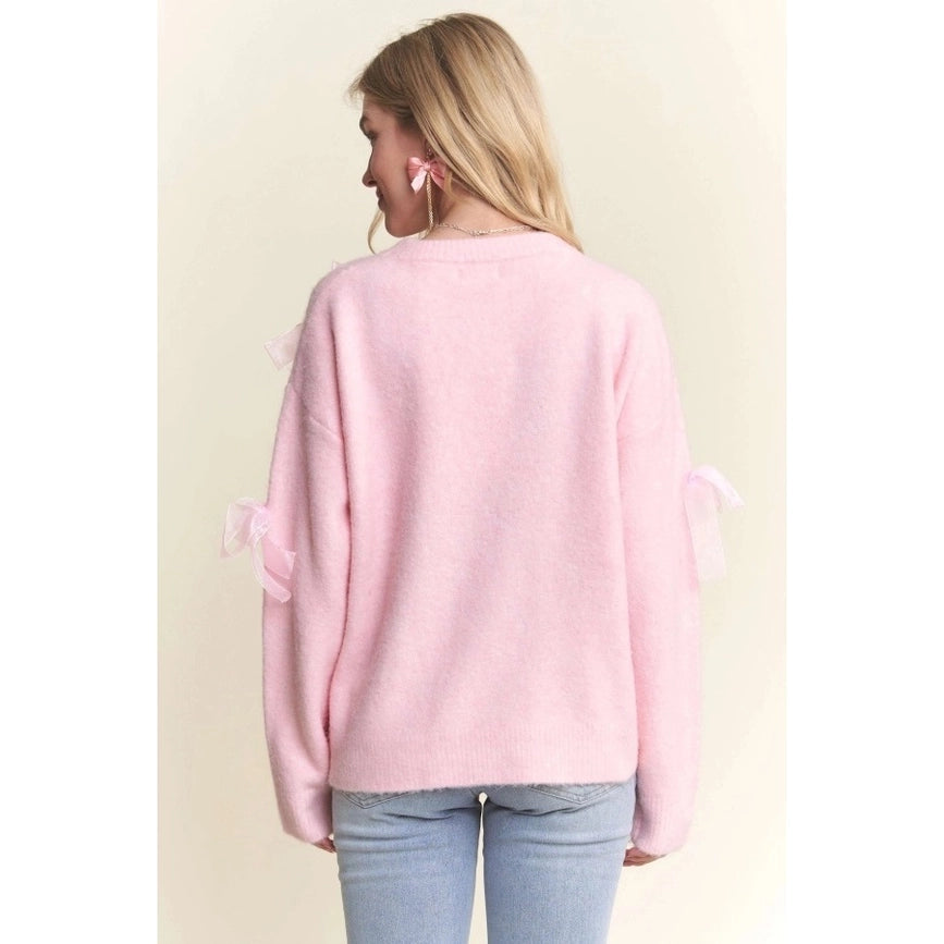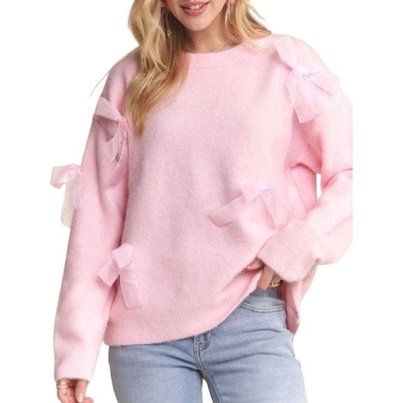 Bow Applique Soft Sweater Drop Shoulder Cozy Knit Charm PINK