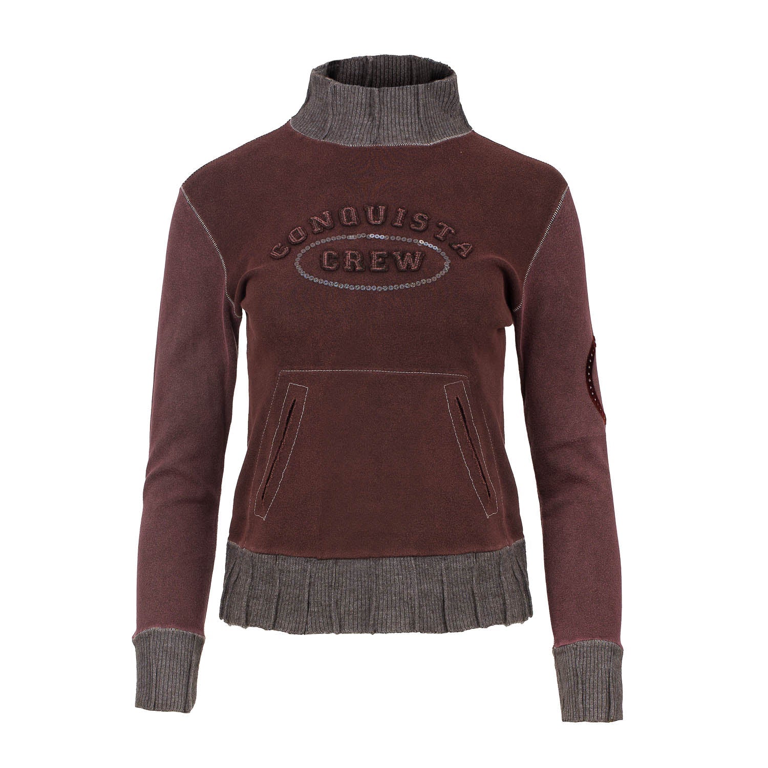 This long sleeve fitted top is crafted in brown fabric with dark grey rib knit on the cuffs, collar and hem. It has embroidery detail in the front and a pouch pocket.