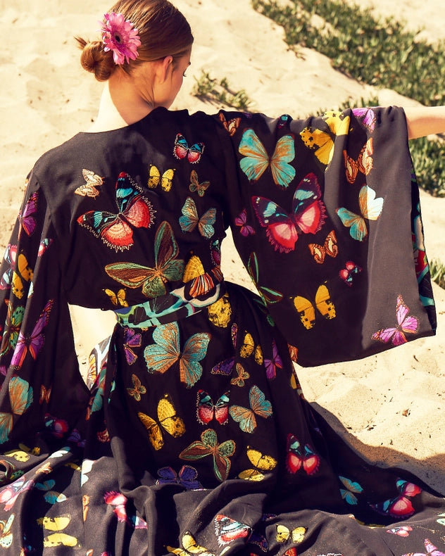 Introducing the Butterfly Maxi Kimono, a luxurious and elegant addition to your wardrobe. Crafted entirely of silk, this stunning piece features a hand-embroidered fluttering butterfly artwork on the back panel. The cross-front design is complemented by an obi inspired tie belt, and completed with an invisible hook and eye closure. Stay chic and comfortable with in-seam hip pockets and a removable silk tie belt.