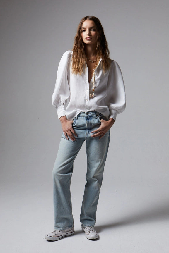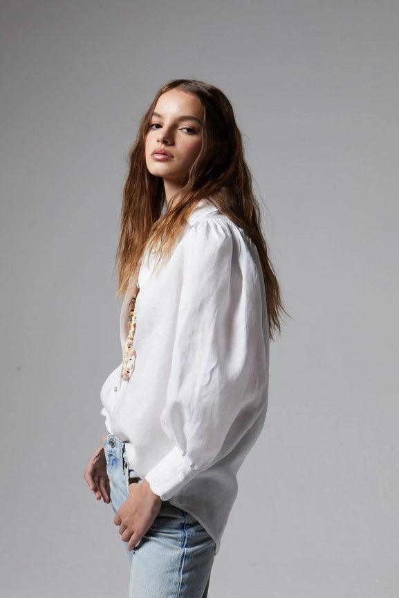 Elevate your wardrobe with the Camille Linen Shirt in White. Made from premium 100% organic linen, this shirt boasts feminine details such as voluminous sleeves and delicate scalloped cuffs. With a flattering and relaxed fit, it's perfect for any season. Pair it with our Cape Linen Pant or New Luna Velvet Pant for a complete look.