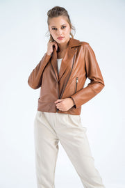 Indulge in luxury with our Cognac Genuine Classic Cut Leather Jacket. Made from natural sheepskin, it offers a lightweight feel and a versatile style that pairs effortlessly with any outfit. With a classic cut and elegant diagonal zipper, it's perfect for both casual and chic occasions. Make a statement with this timeless fashion piece.