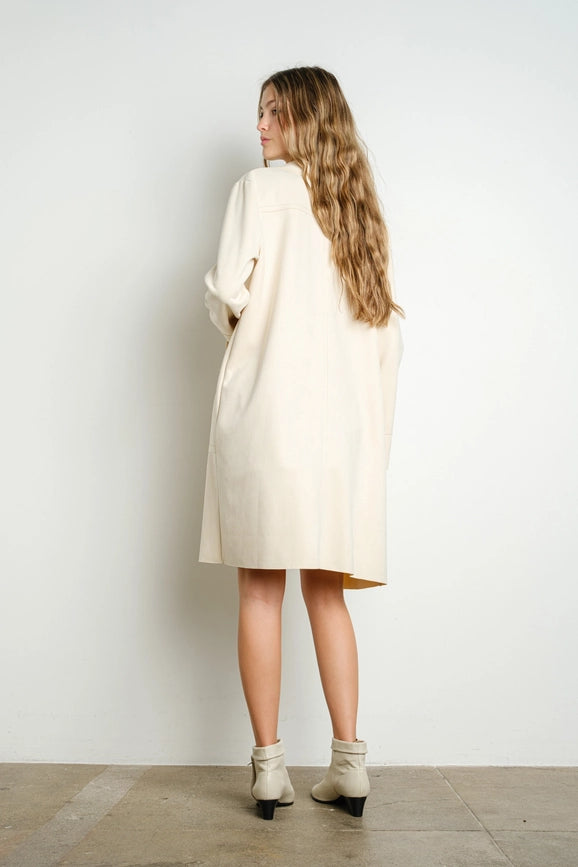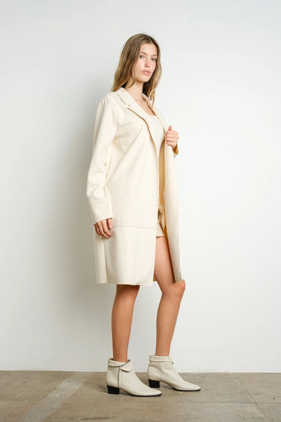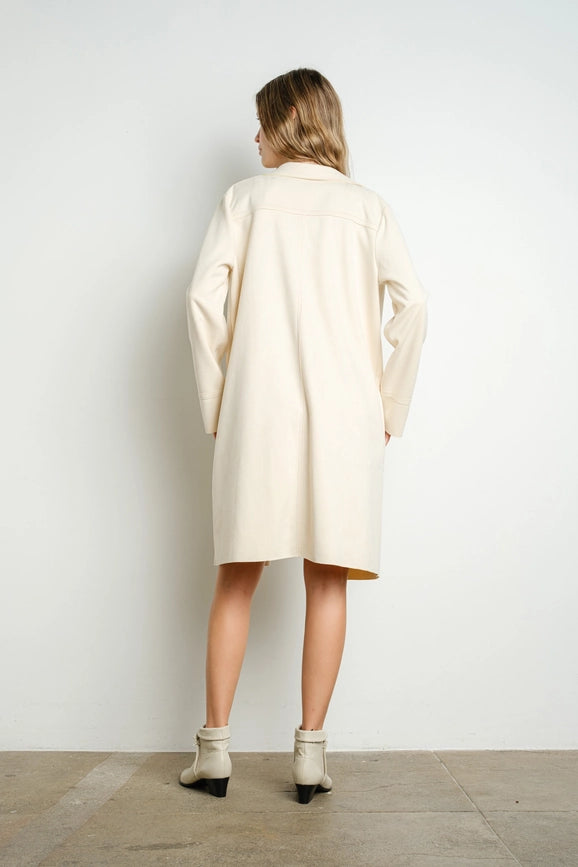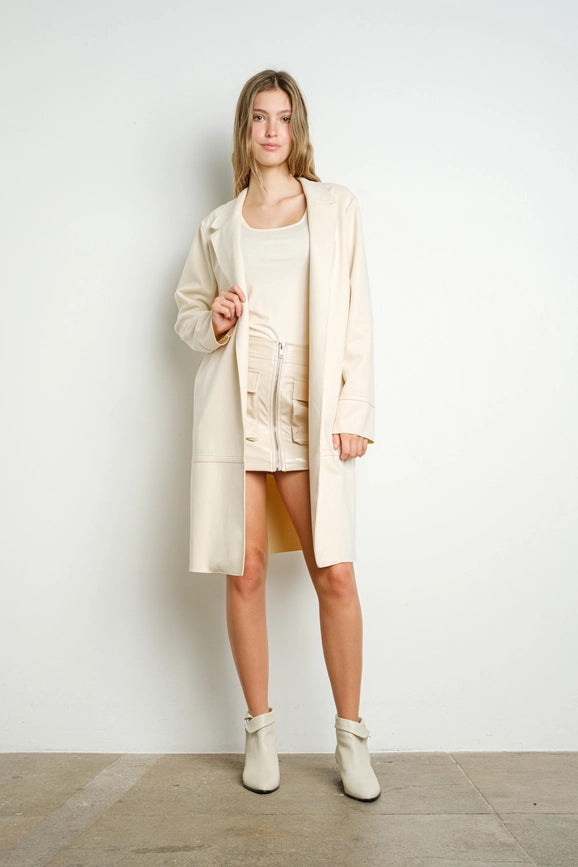 Introducing our Collared Faux Suede Woven Midi Jacket, the perfect combination of style and comfort. With its loose fit and unlined design, this faux suede coat is not only fashionable but also allows for easy movement. The collared lapel and pockets add a touch of sophistication to any outfit. Expertly crafted for maximum comfort and style.