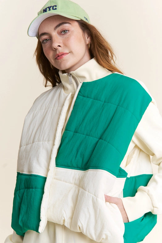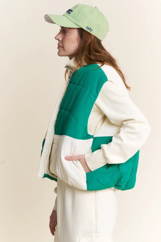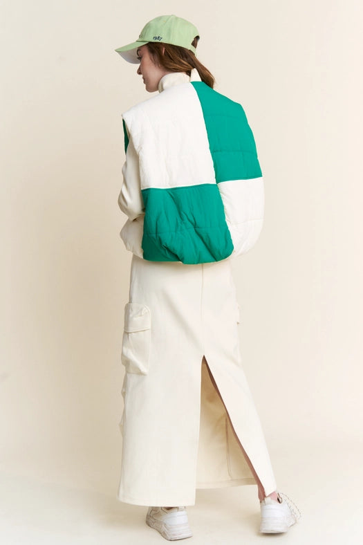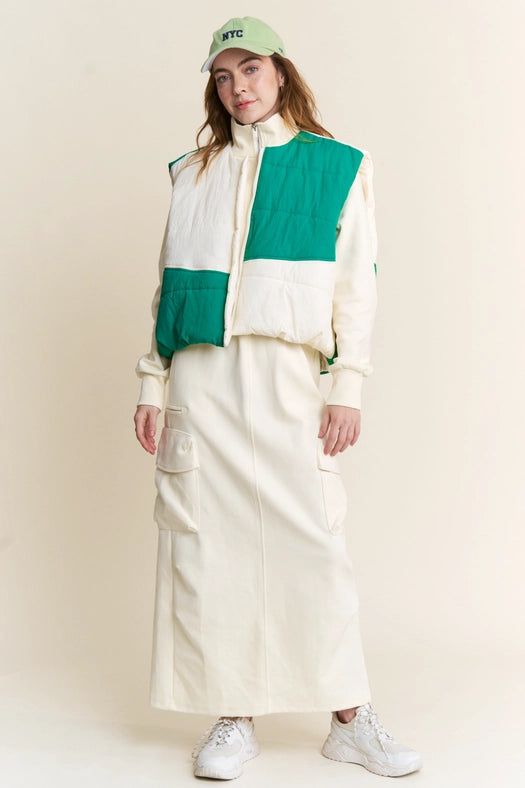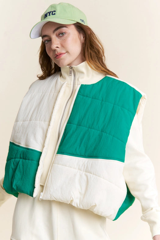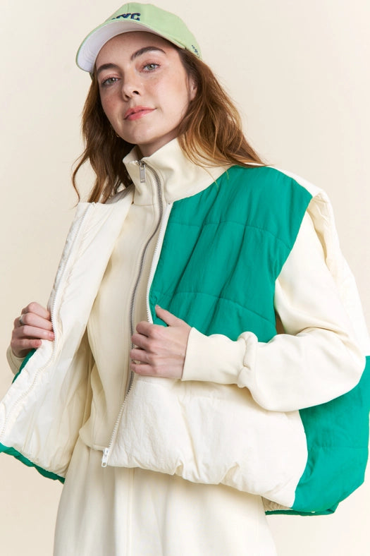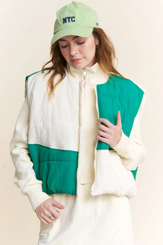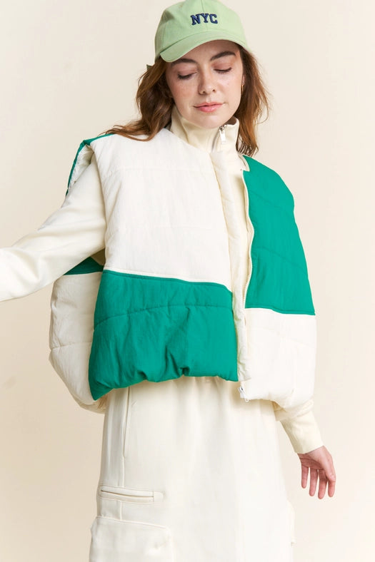 Color Block Zipper Puffer Vest-Vest-J.NNA-S-Green Ivory-Urbanheer