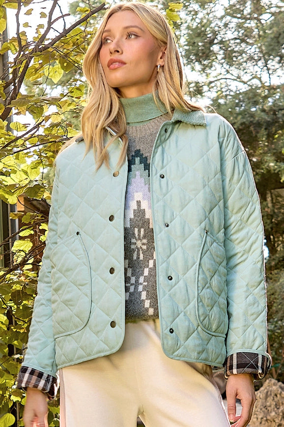 The Contrast Quilted Jacket combines style and functionality with snap buttons, a corduroy collar, and pockets for convenience. With its plaid inner lining, this jacket is perfect for both day-to-day wear and outdoor activities. Stay warm and on-trend in any weather with this versatile jacket.