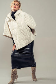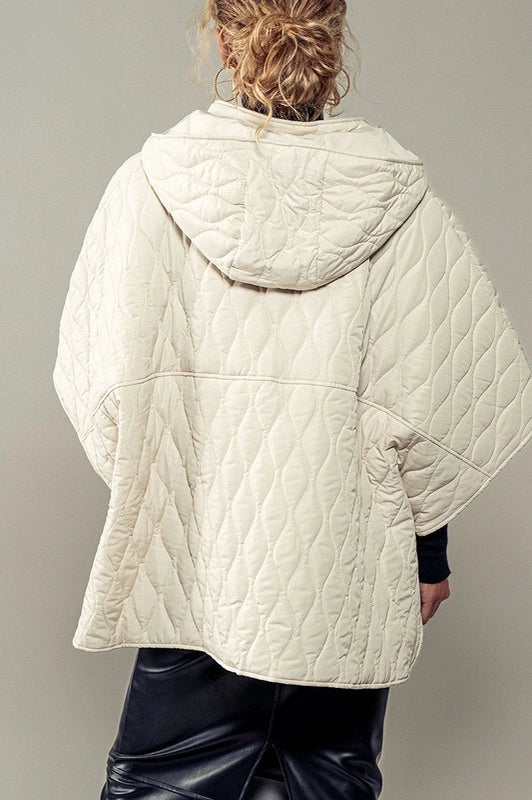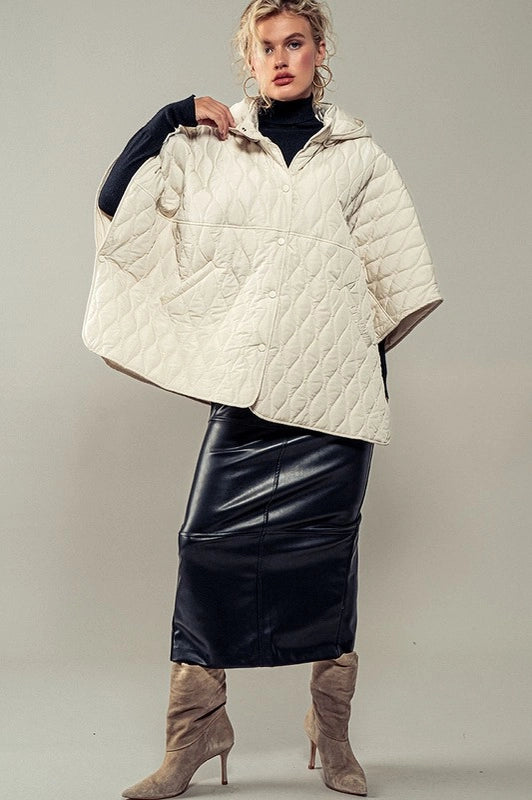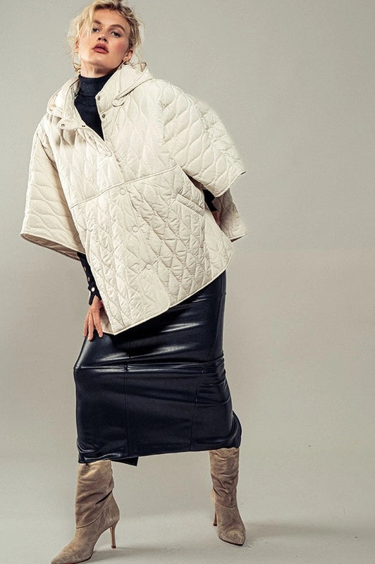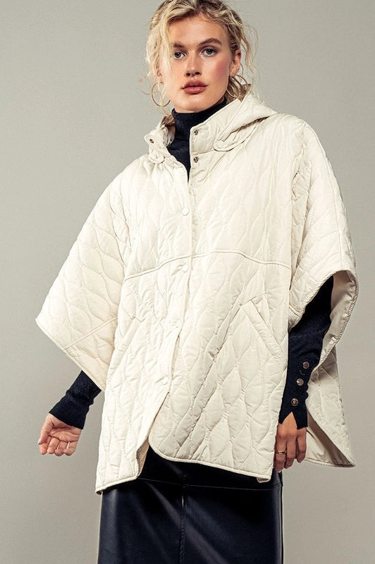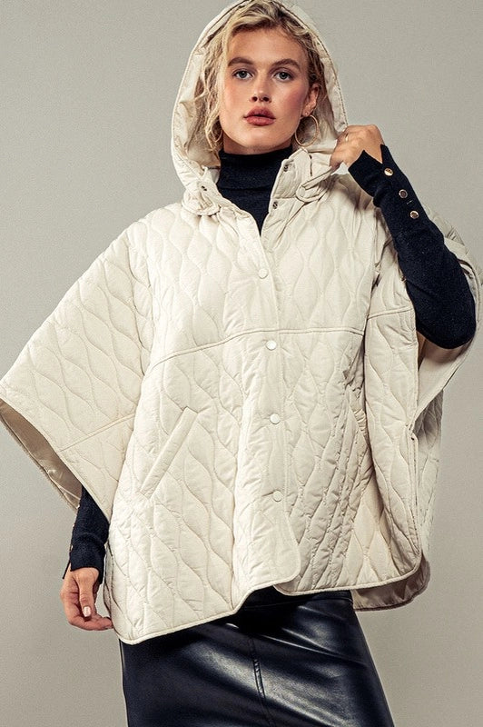 This quilted cloak boasts a snap button closure for easy wear and a contrast color lining for added visual appeal. With a hoodie and wide 3/4 sleeves, it offers both style and practicality. A must-have for any fashion-forward individual seeking warmth and versatility.