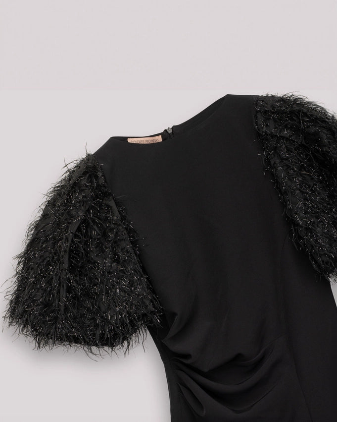 The Cecilia Feather Dress is the perfect choice for winter parties. Made in Spain, this elegant dress features a round neckline and light draping at the waist for a flattering fit. The short, tapered sleeves are made of feather fabric, giving this dress a dazzling touch. With an invisible back zipper, this dress is both stylish and easy to wear. Pair it with our Party Dresses collection for a complete look.