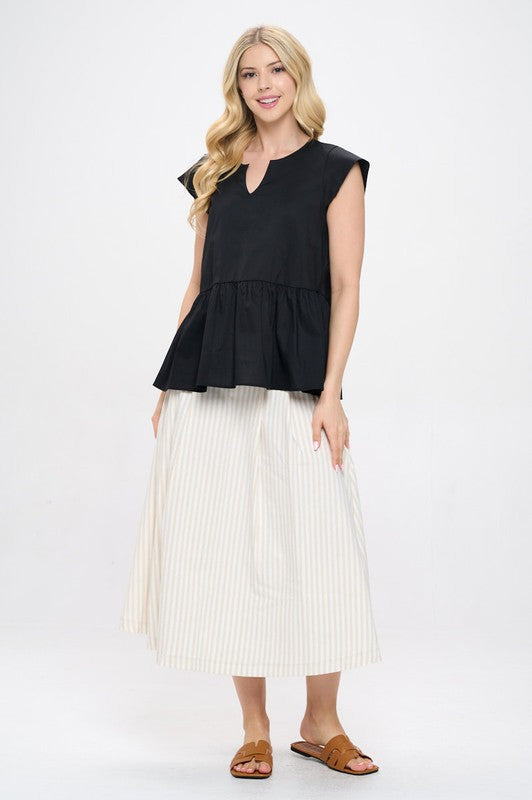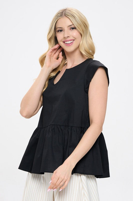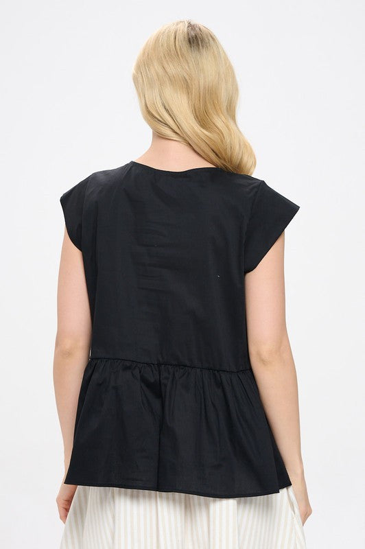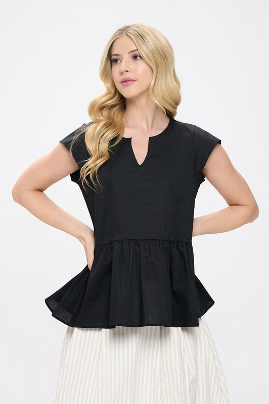 Cotton V neck Short Sleeve Top with Tiered Hem