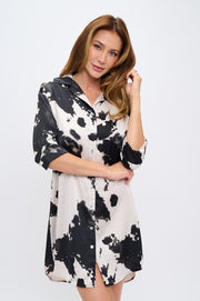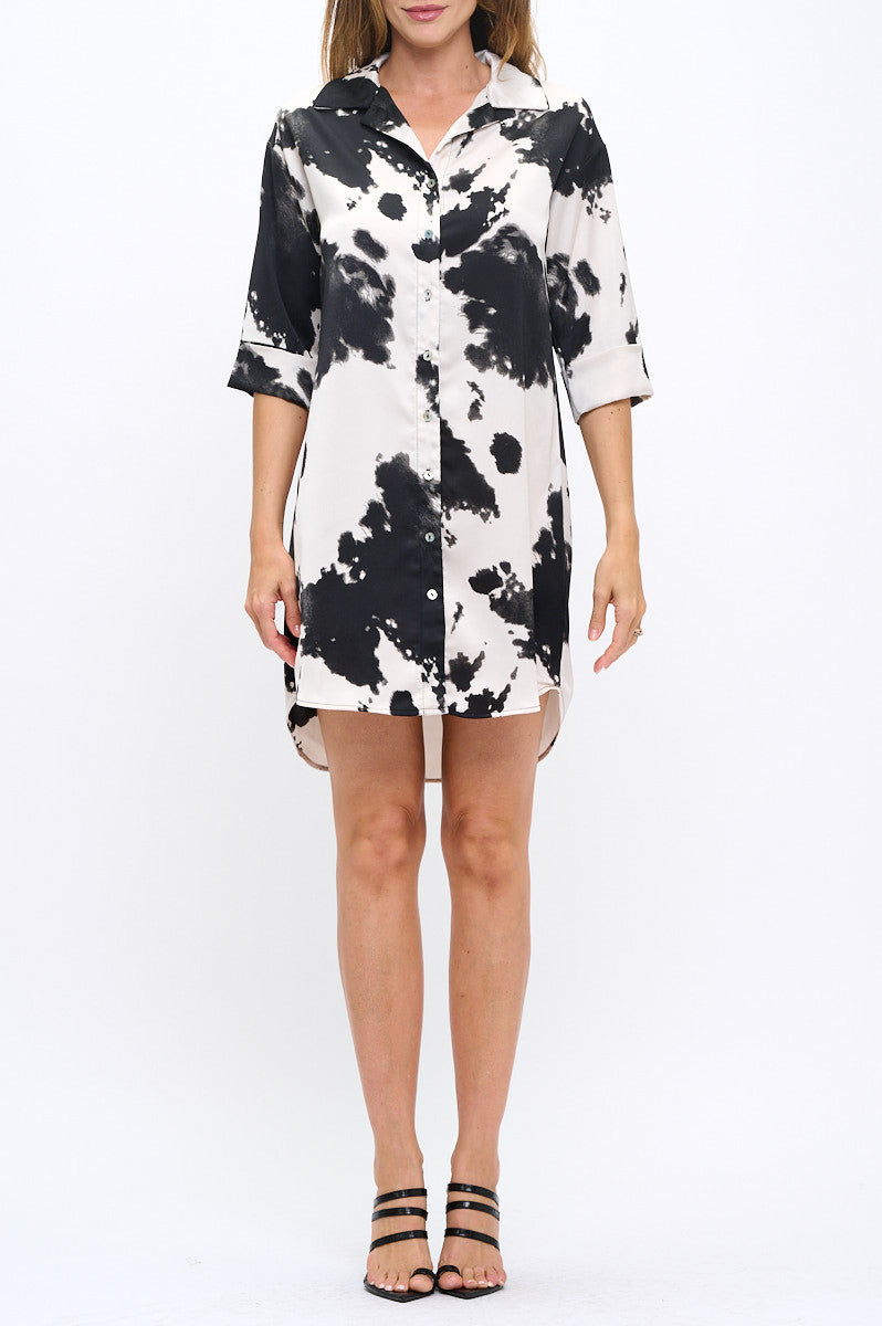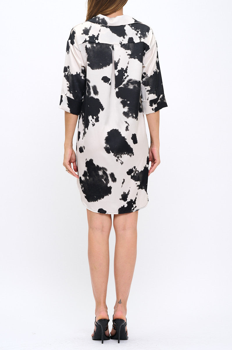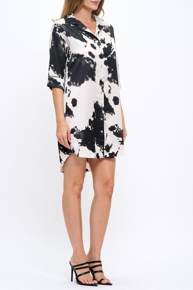 Made in USA Cow Print Collared Dress with Hi-Low Hem. Fabric content: 97% Polyester, 3% Spandex.