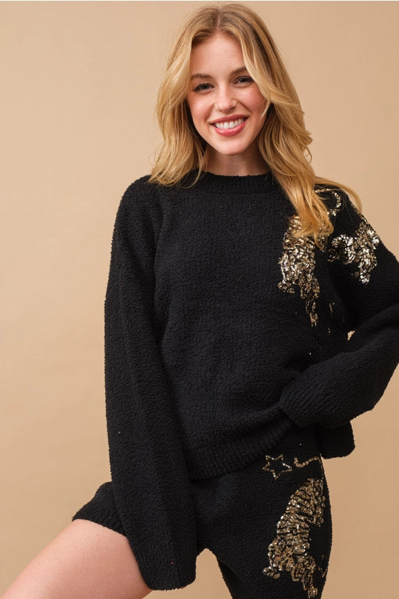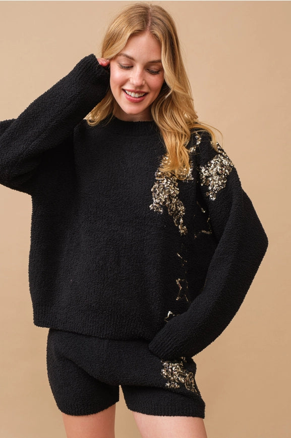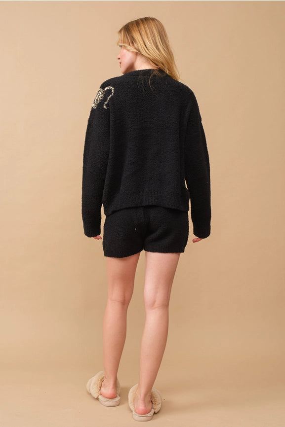 Cozy Knitted Sequin Sweater and Shorts Set Black