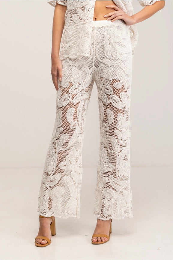 Elevate your fashion game with our Crochet Knitted Pants. These high waist pants feature intricate embroidery and an elastic waist for a comfortable fit. Made with 65% cotton and 35% polyester, these pants are perfect for any occasion. Made in China for quality and style.