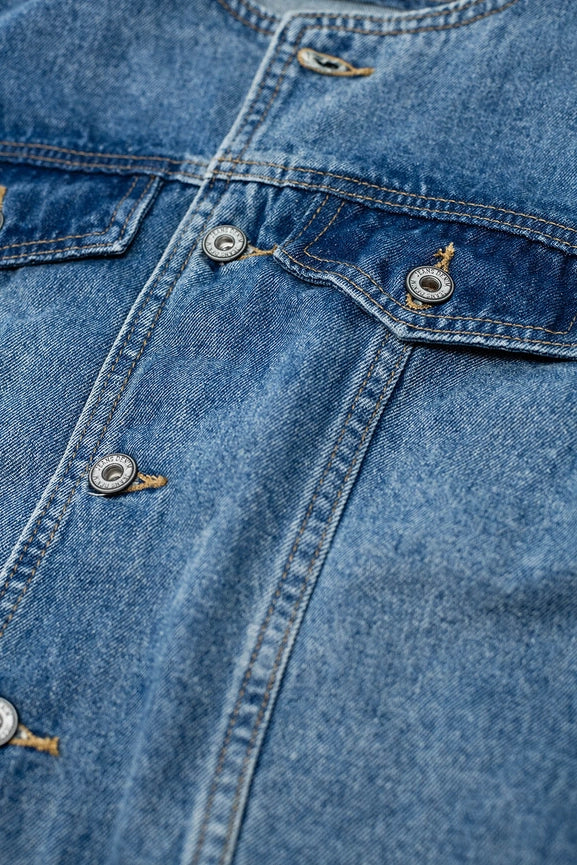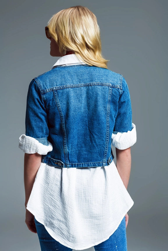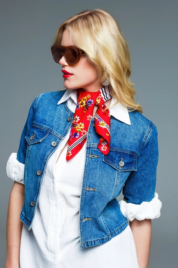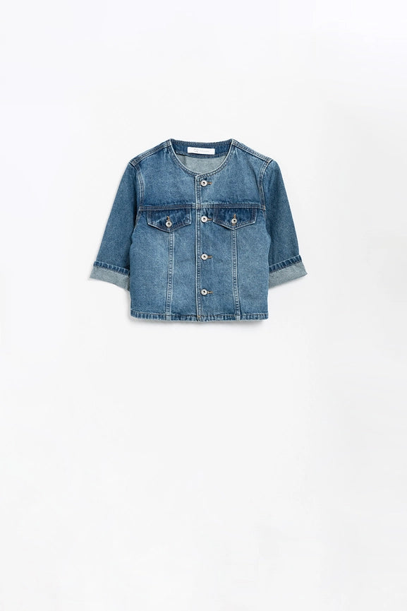 Expertly crafted for a bodycon fit, this Cropped Denim Jacket Ch Style in Mid Wash features a flattering crew neckline and 3/4 length sleeves. Made from stretch denim fabric, it offers both style and comfort. Perfect for daily wear during the fall/winter season. Machine washable and made from a blend of 85% cotton, 12% viscose, and 3% polyester. Please note, this jacket runs small.