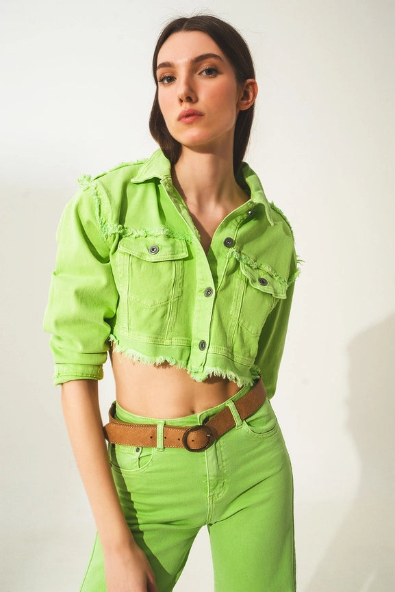 Stay on-trend with this acid green cropped denim trucker jacket. Made with stretch denim and a distressed design, this casual jacket features a wide collar neckline, long sleeves, and functional pockets. Perfect for spring and summer, it runs true to size and can be easily cared for with a simple machine wash. Upgrade your wardrobe with this must-have jacket.