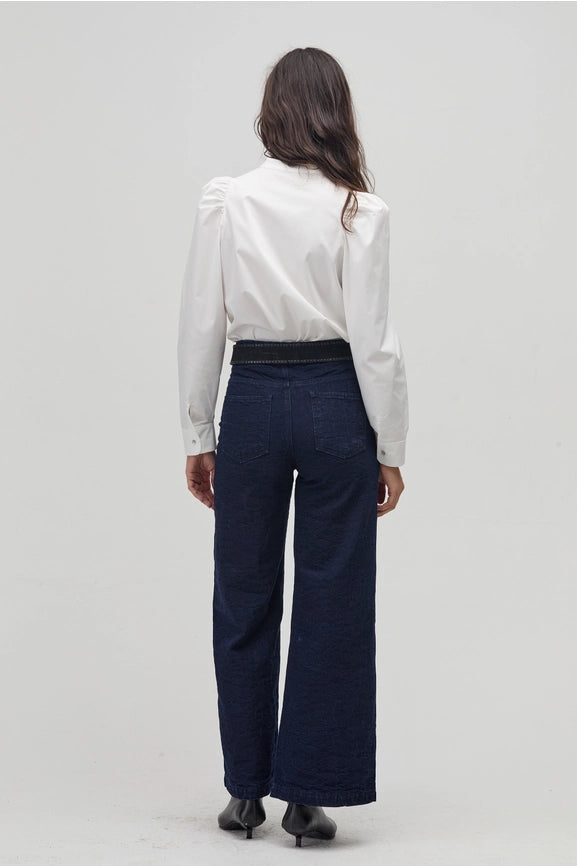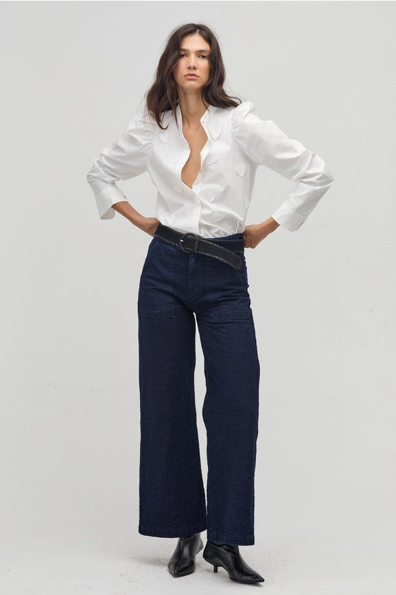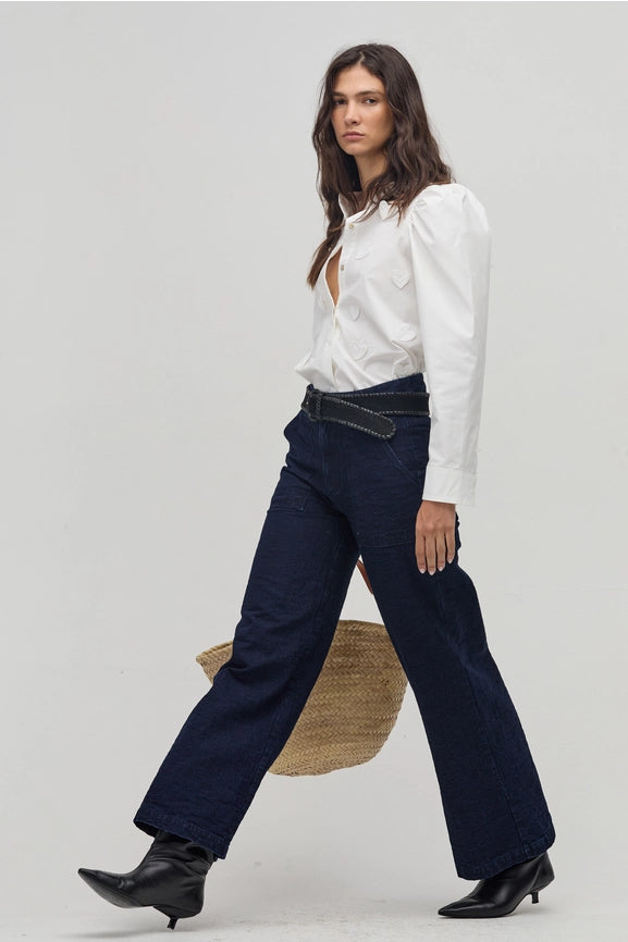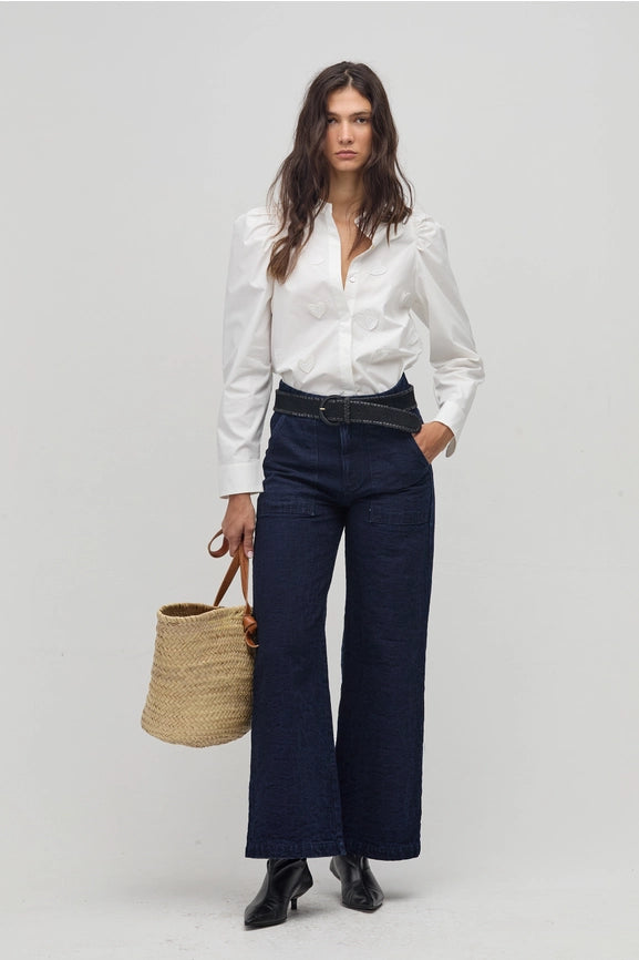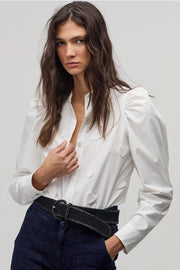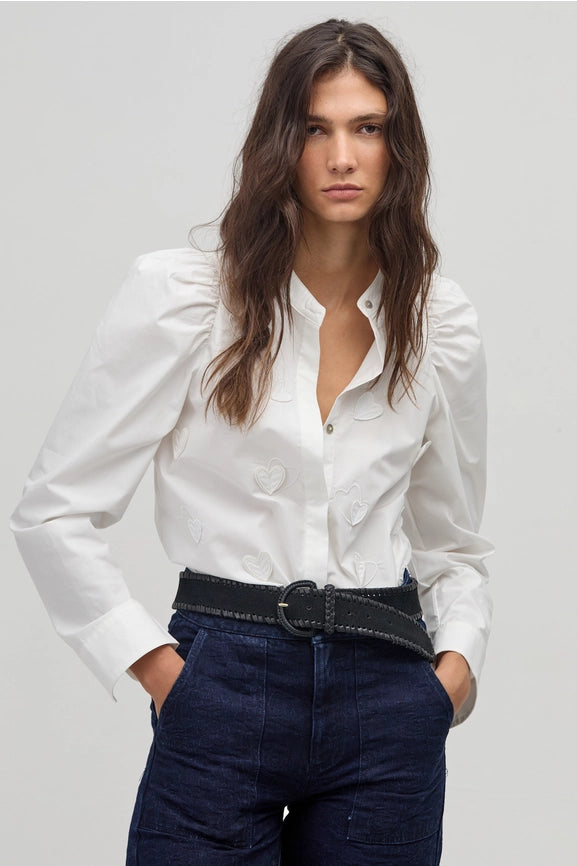 The Cuore Poplin Shirt in white is the perfect blend of fun and femininity. Made from 100% cotton poplin, this shirt features adorable embroidered hearts and a flattering dropped shoulder design. With a mao collar, puffy shoulders, and mother-of-pearl buttons, it's versatile for any occasion. Made in Vietnam and machine washable.