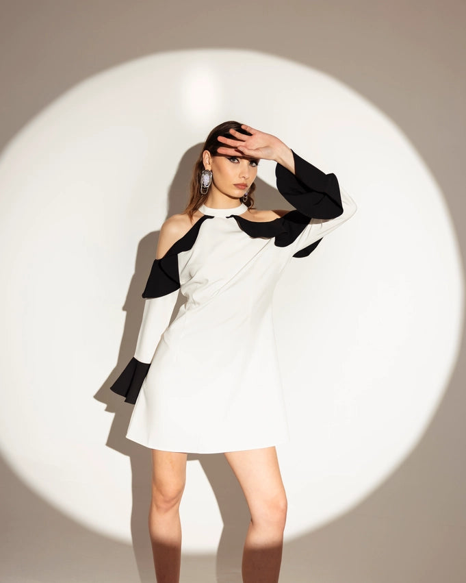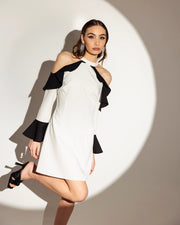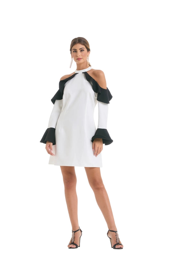 Expertly crafted in Italy, this short dress combines style and comfort. The cut-out shoulders and American neckline exude sophistication, while the contrasting ruffles add a touch of playfulness. Perfect for any occasion, from daytime events to glamorous parties. Made with 96% polyester and 4% spandex for a comfortable and flattering fit.
