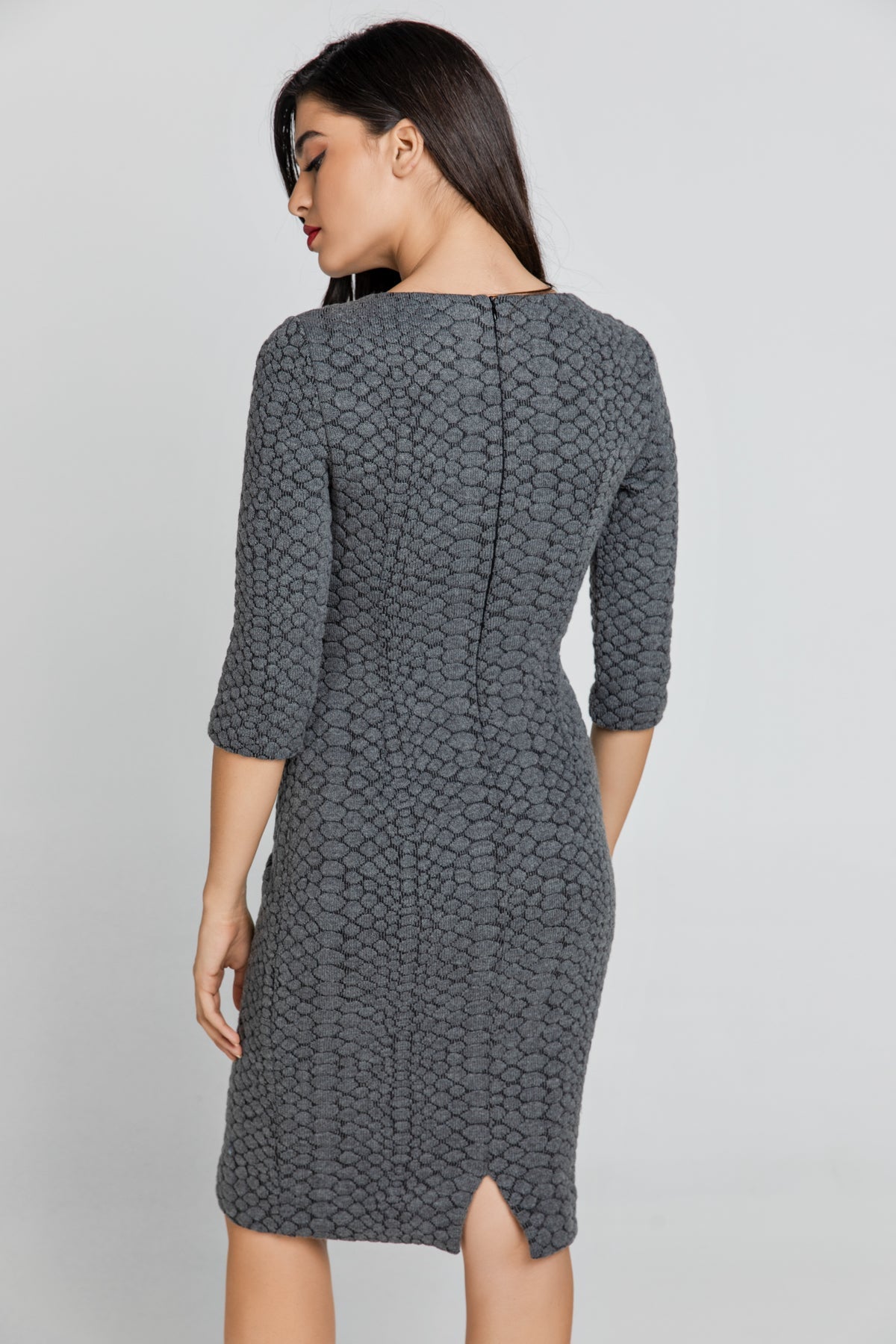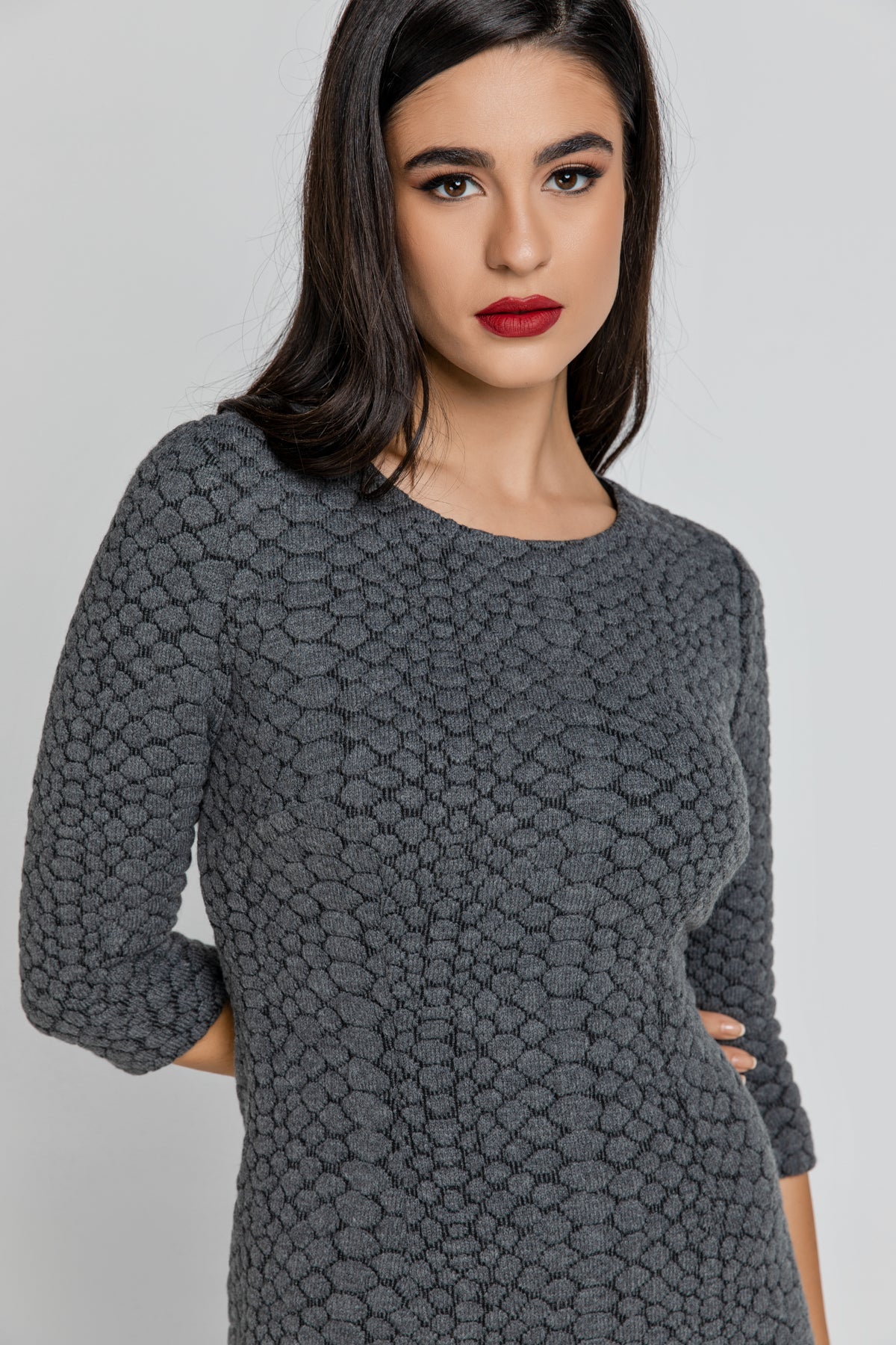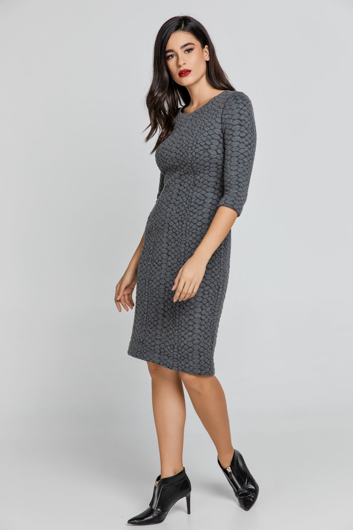 Dark grey dress in knit jacquard fabric. ¾ sleeves and a round neckline. Slit at the back. Lined. Fitted. Knee length. Our model is 176cm and is wearing size 36/S. Measurements for size 36/M (in cm): Shoulder -37, Chest-40, Waist-35, Bottom-43, Sleeve length -40, Body length-101. Accessories are not included. 65%acryl-24%polyamid-11%wool