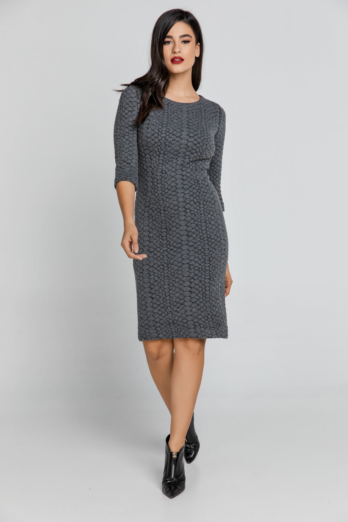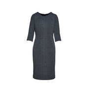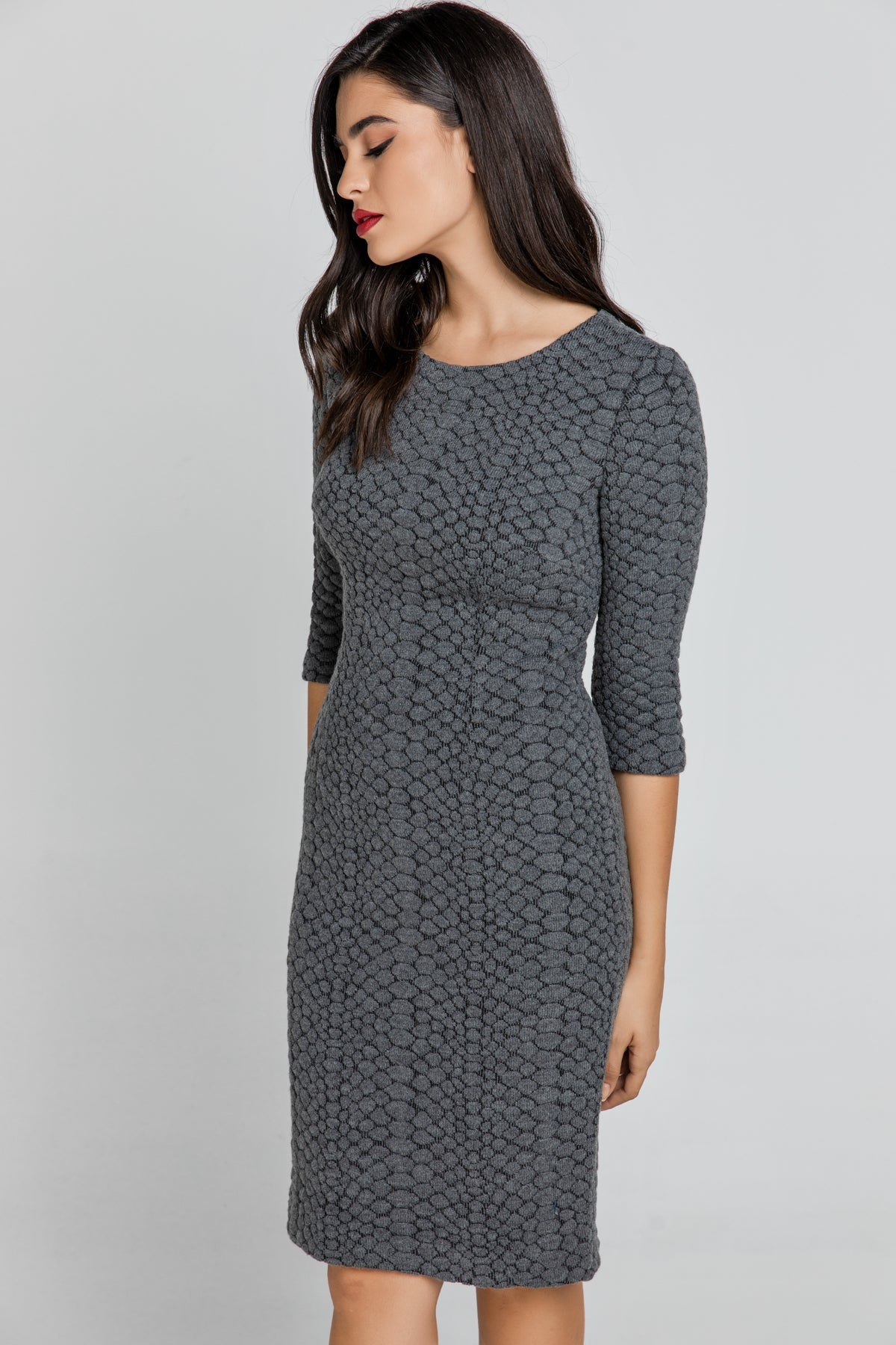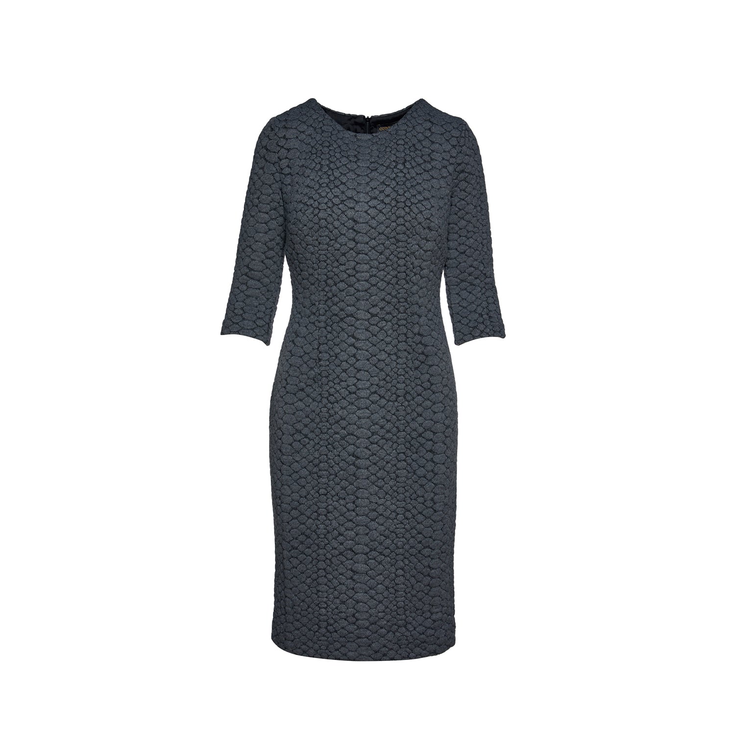 Dark grey dress in knit jacquard fabric. ¾ sleeves and a round neckline. Slit at the back. Lined. Fitted. Knee length. Our model is 176cm and is wearing size 36/S. Measurements for size 36/M (in cm): Shoulder -37, Chest-40, Waist-35, Bottom-43, Sleeve length -40, Body length-101. Accessories are not included. 65%acryl-24%polyamid-11%wool