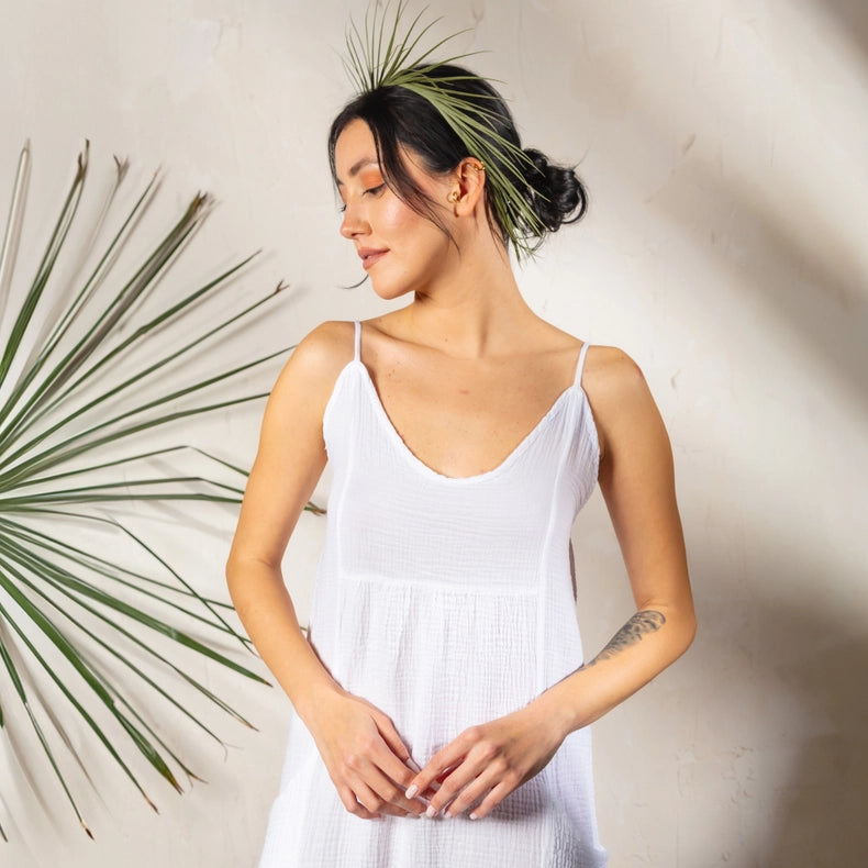 Experience comfort and style in our Double Gauze White Strap Midi Dress. Made of 100% double-layered muslin cotton, this dress has a luxurious feel and high-low hemline that drapes beautifully. Its natural cotton fibers create a soft, pillowy texture, perfect for hot summer days. Made in Turkey, this dress is breathable, non-transparent, and perfect for everyday wear.