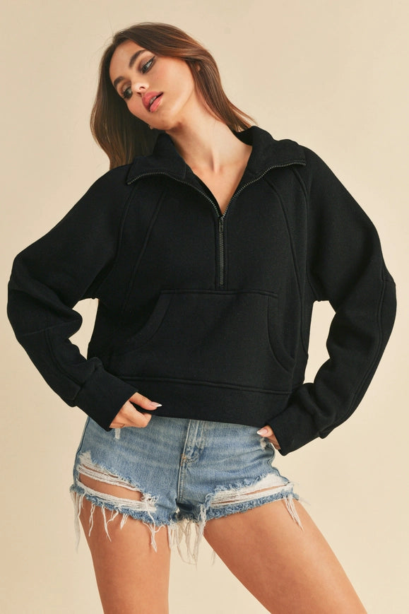 Elevate your comfort game with the Drea Half-Zip Hoodie. Its oversized design offers ultimate coziness and versatility on-the-go. Made with a naturally breathable cotton-blend fleece, it provides lightweight warmth for any season. The waist-length and kangaroo pocket with thumbholes add functionality to this must-have fashion statement. Embrace the softness and effortless style wherever your adventures take you.