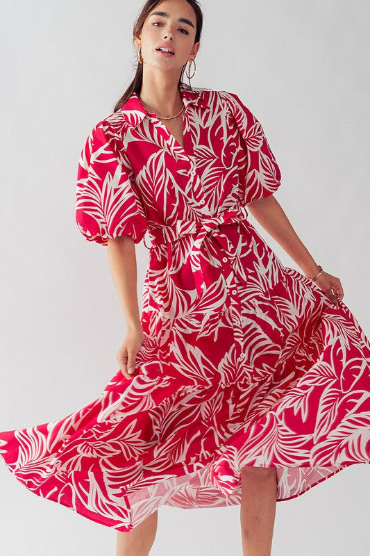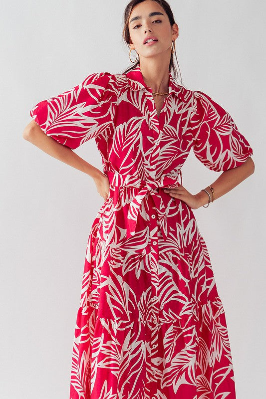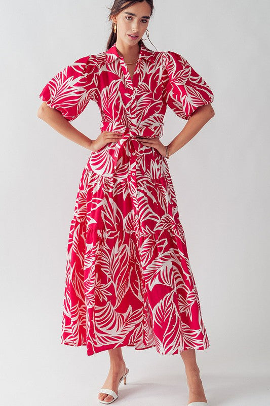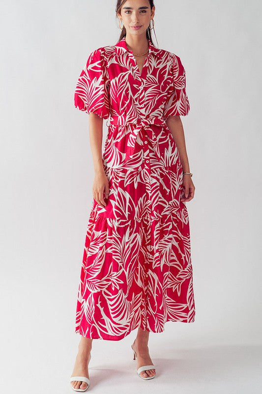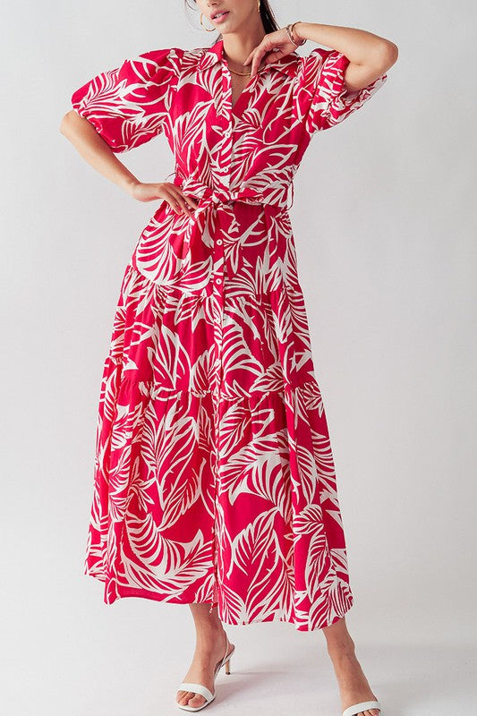 This Elsie Tropical Print Maxi Sundress features puffy sleeves, a collared button down design, and a belted tie for a flattering fit. Made from 100% cotton, this dress is lightweight and comfortable, perfect for any day out. The leaf plant print adds a touch of tropical beauty to any wardrobe.