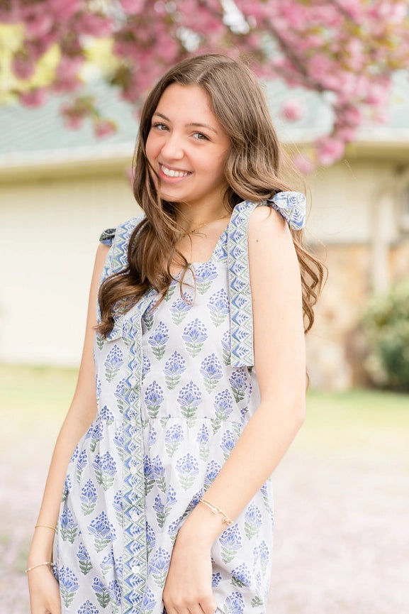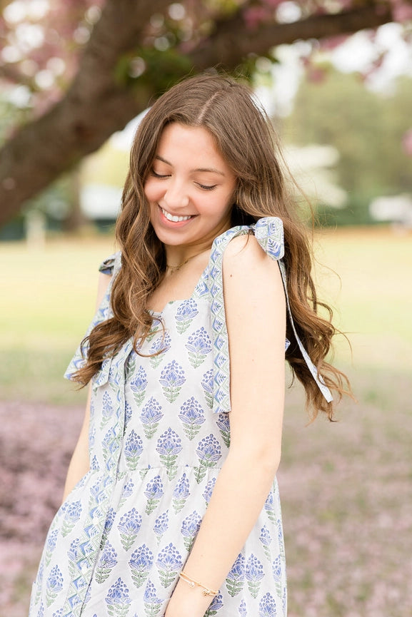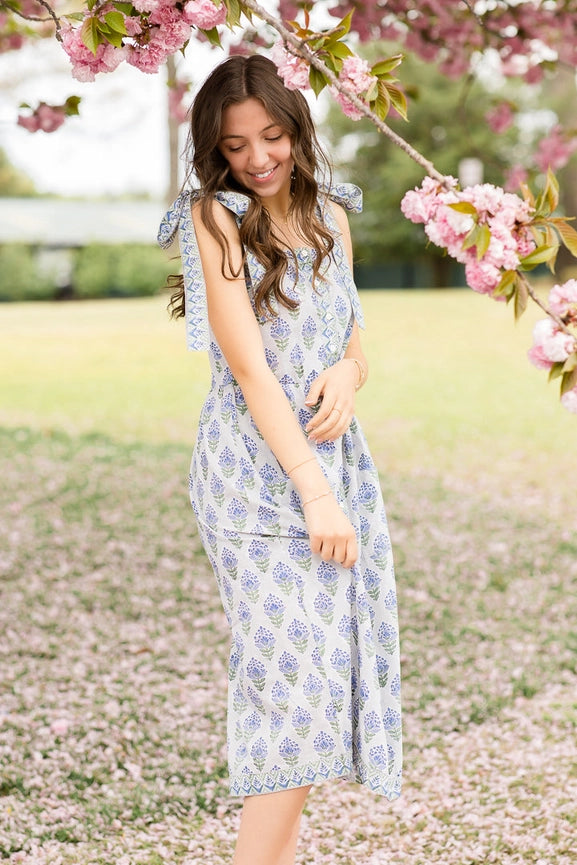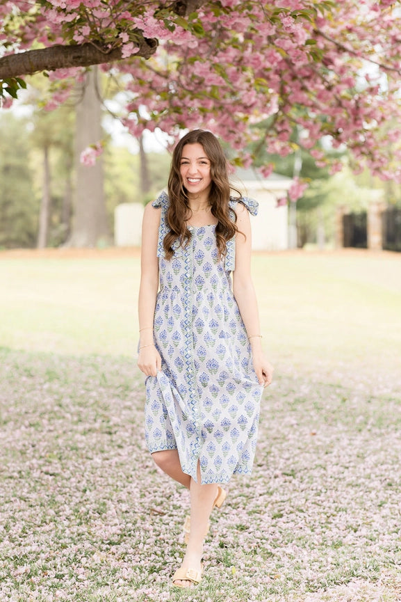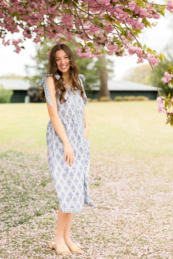 Elevate your summer wardrobe with the Emmie Midi dress in Bluebell. Made from 100% breathable cotton, this chic and comfortable dress features shoulder ties and a button down placket with a fun border print. Handmade in Jaipur, stay cool and stylish in this versatile piece, perfect for any occasion. Recommended hand wash or dry cleaning.