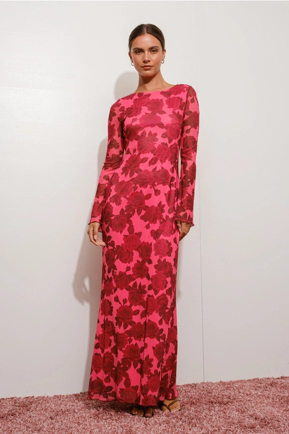 Exclusive Floral Print Bell Sleeve Maxi Dress-Dress-Pretty Garbage-S-Red-Urbanheer