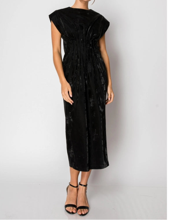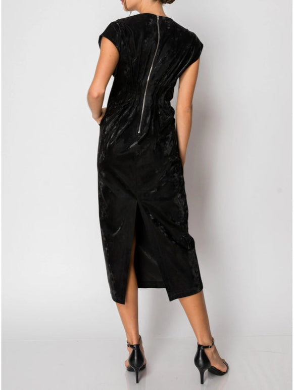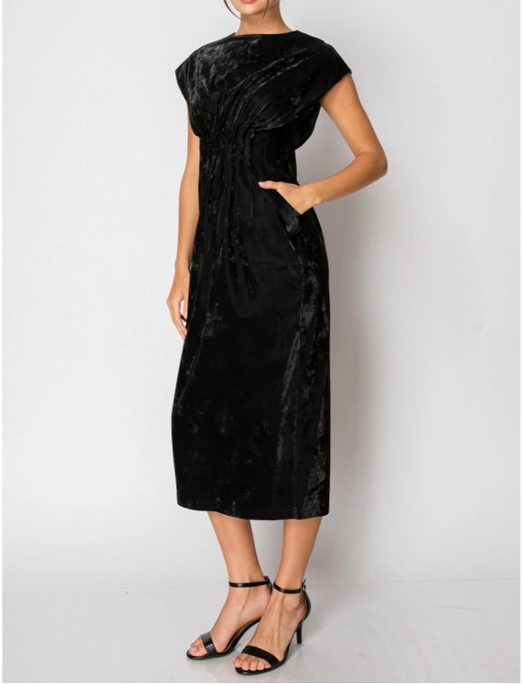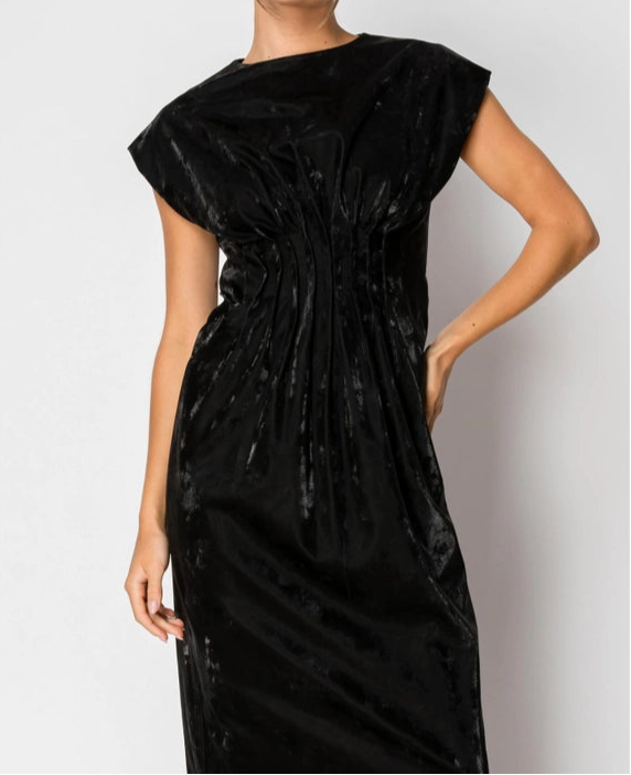 Elevate your style with our Faux Leather Structured Draping Midi Dress. Featuring a structured bodice with intricate draping, this dress creates a defined waistline and adds a touch of elegance to your silhouette. The cap sleeve cut, metal zip at the back, and convenient side pocket make it both fashionable and functional. Made with a blend of 50% PU and 50% polyester, this dress is perfect for any occasion. Model is 5'9.5" and wearing a size small.