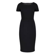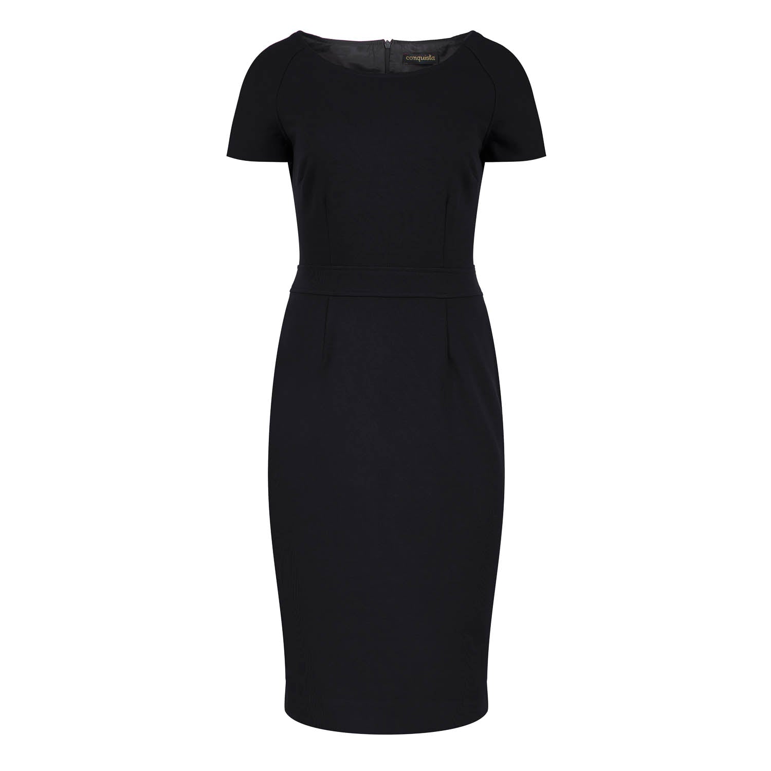 This black dress has a round neckline and cap sleeves. There are darts at the bust ensuring the perfect fit. It fastens in the back with a black concealed zip. It has a slit at the back. The dress is lined. The garment hits at the knee and is fitted. 70%viscose-25%polyamid-5% elastane. Our model is 176cm and is wearing size 36/S. Measurements for size 36/S (in cm): Shoulder -40, Chest-41, Waist-36, Bottom-42, Sleeve Length-16, Body length-101. Accessories are not included.