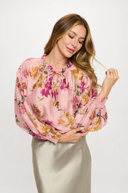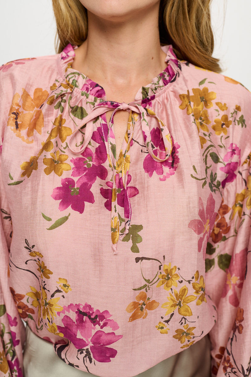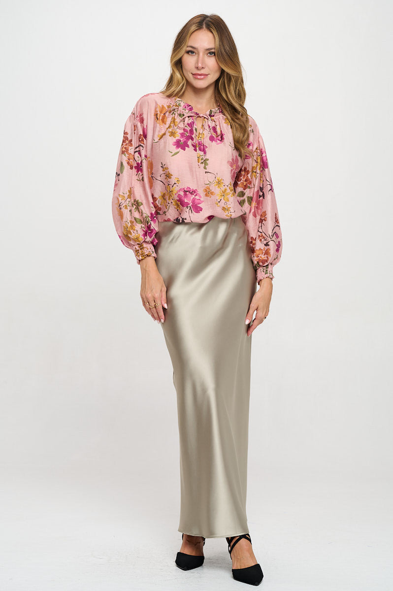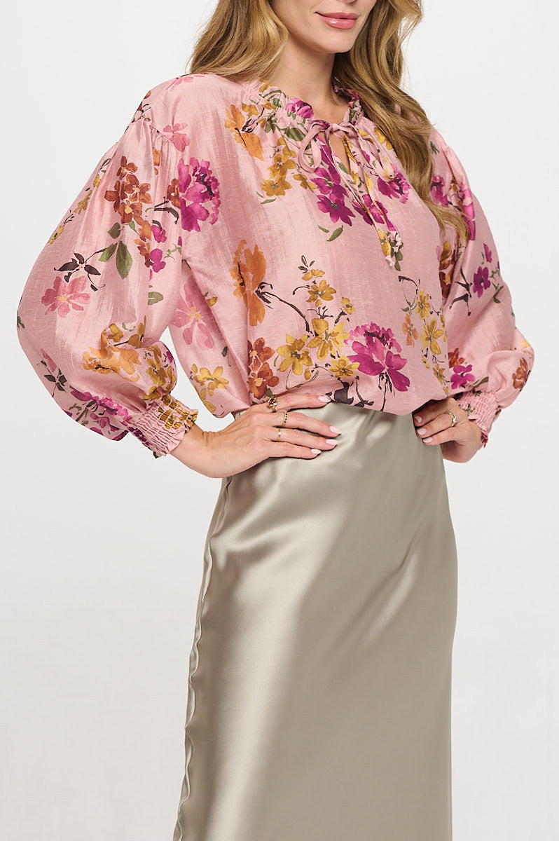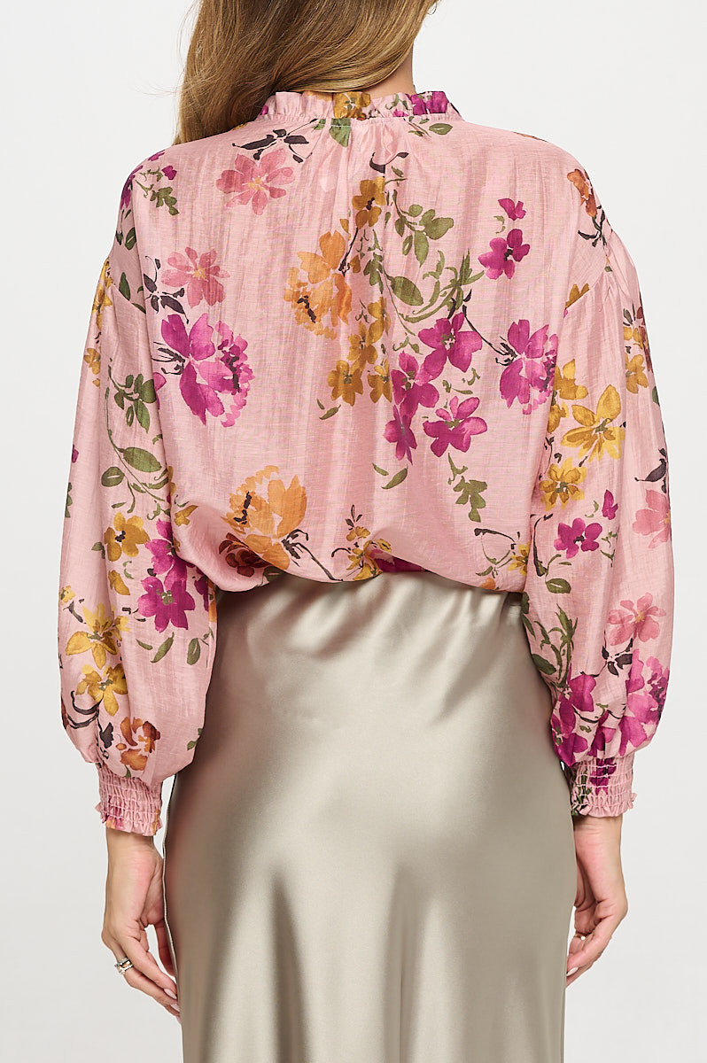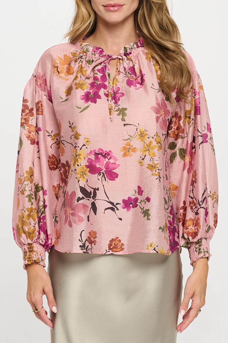 Made in USA Floral Print V neck Top with Cuffed Sleeve. Fabric content: 75% Tencel, 25% Nylon.