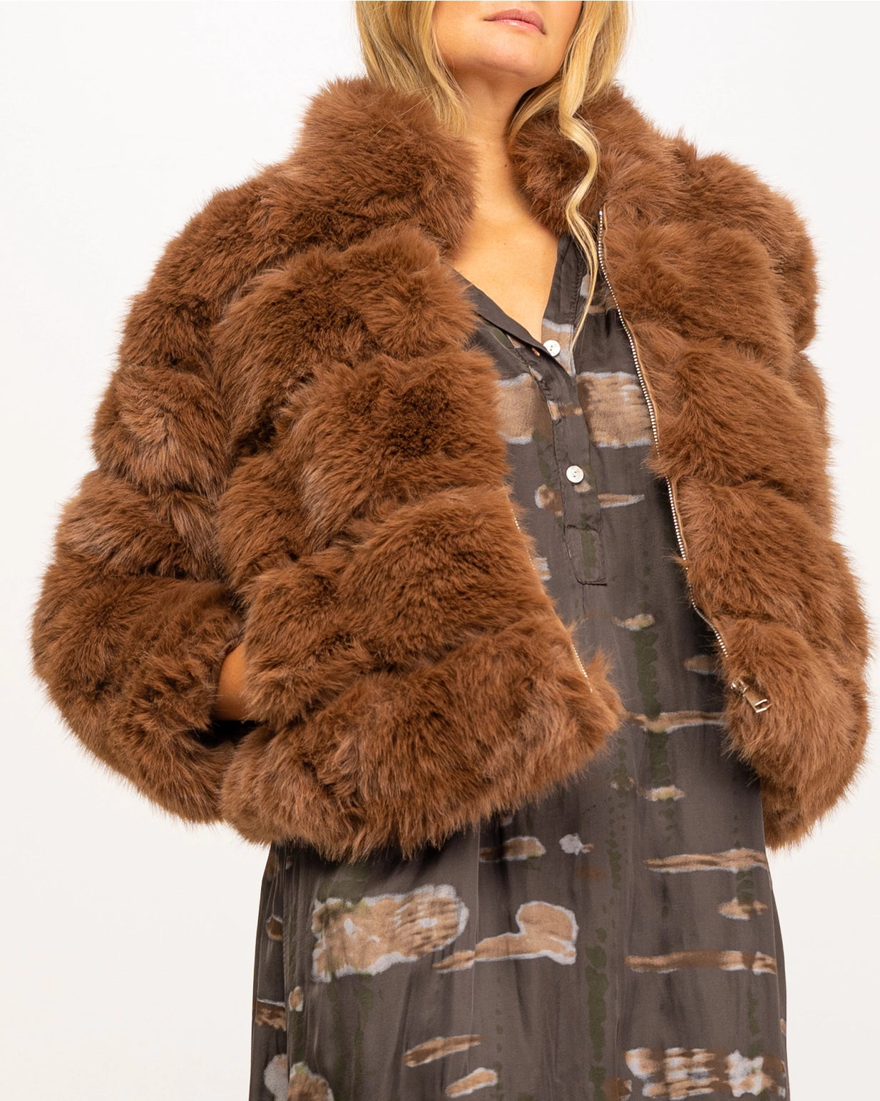 This short-length bomber jacket is crafted from a luxurious fur material and features a convenient zip closure and handy pockets.