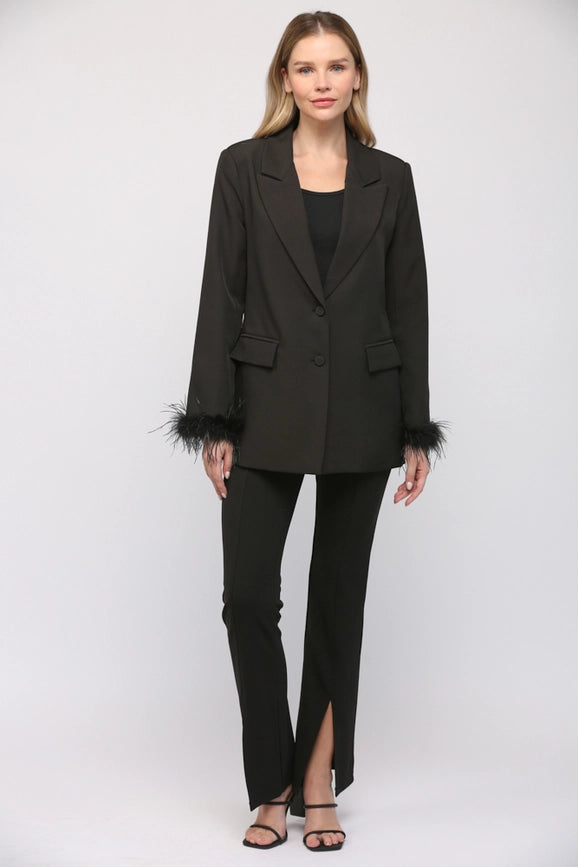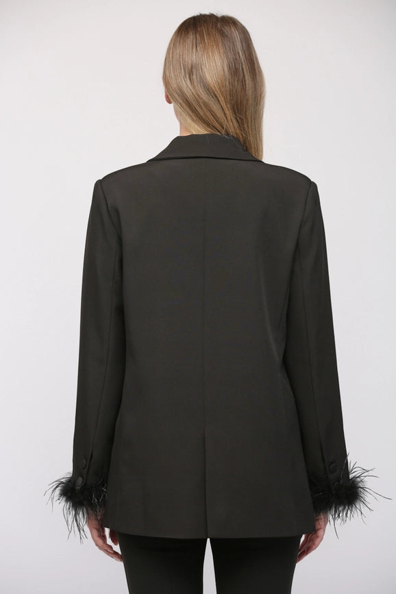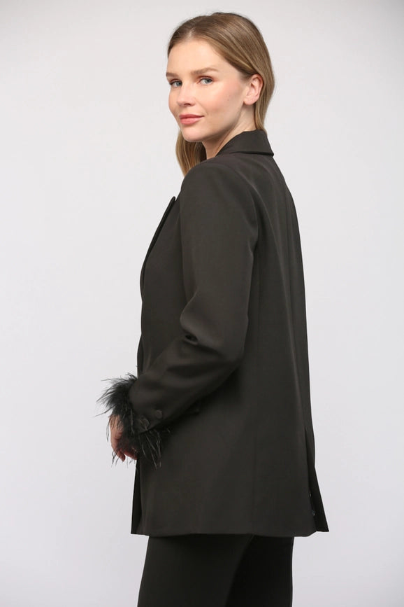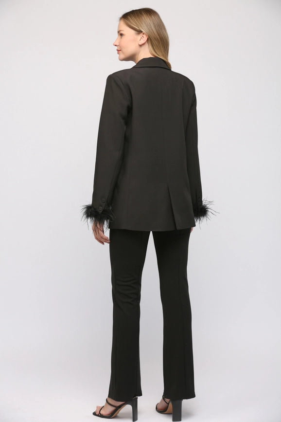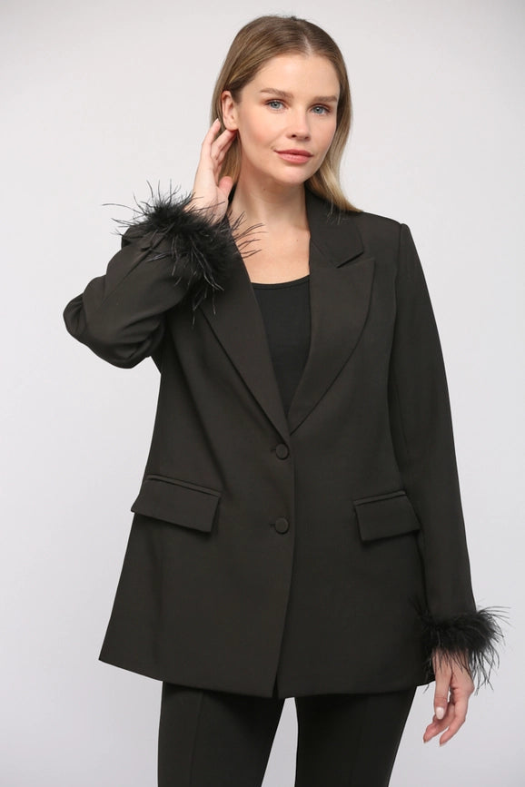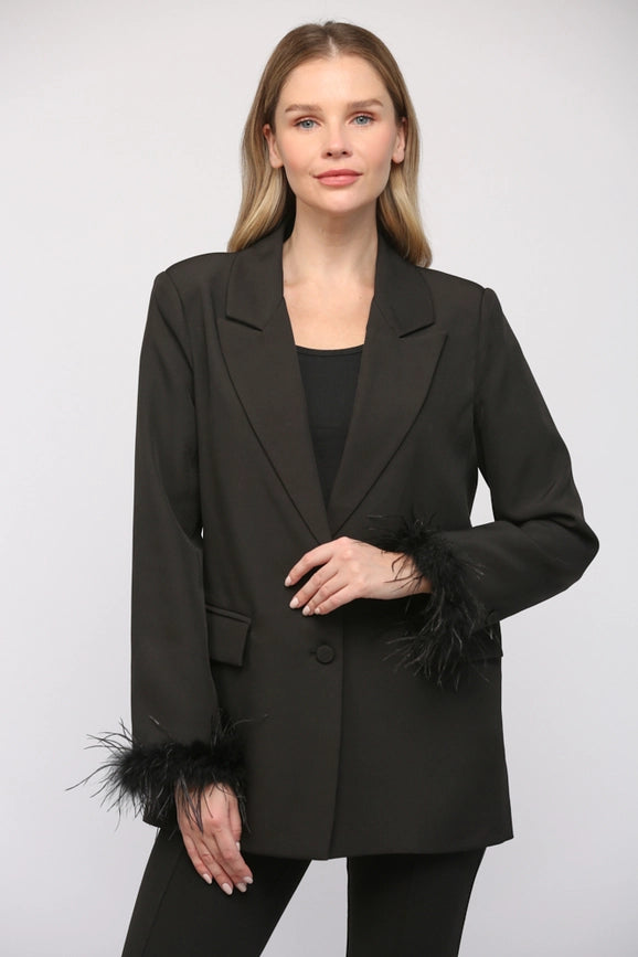 Expertly designed with a 96% polyester and 4% spandex self and 100% polyester lining, our Fur Trimmed Single Breasted Jacket offers both style and comfort. The luxurious fur trim adds a touch of elegance while the single-breasted design provides a sophisticated look.