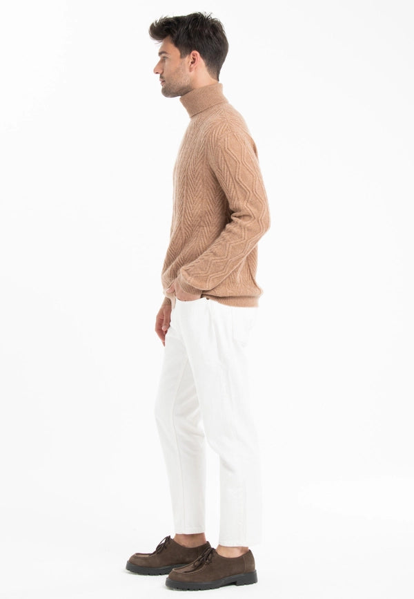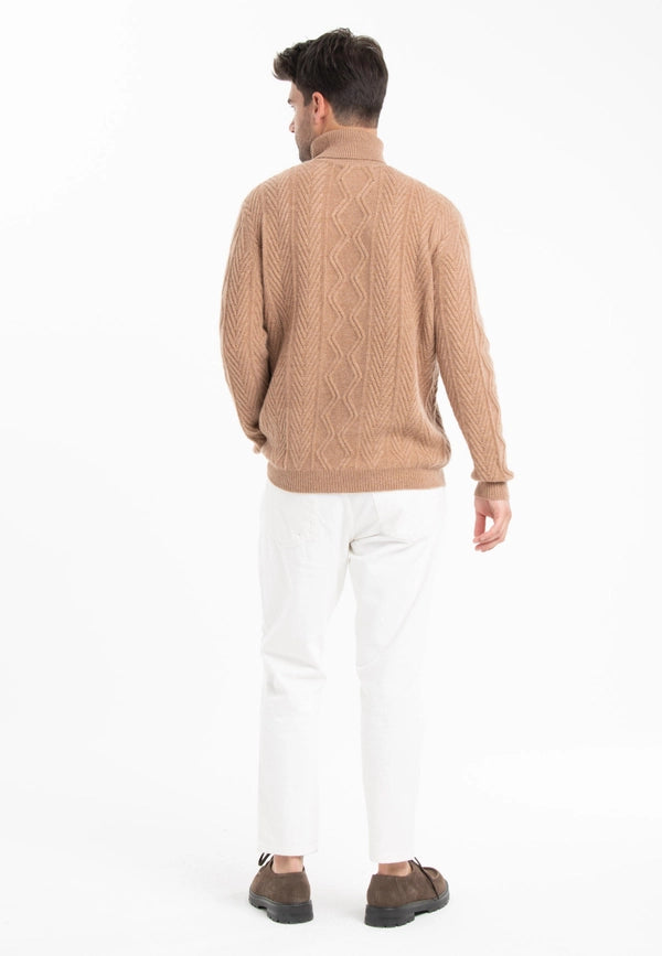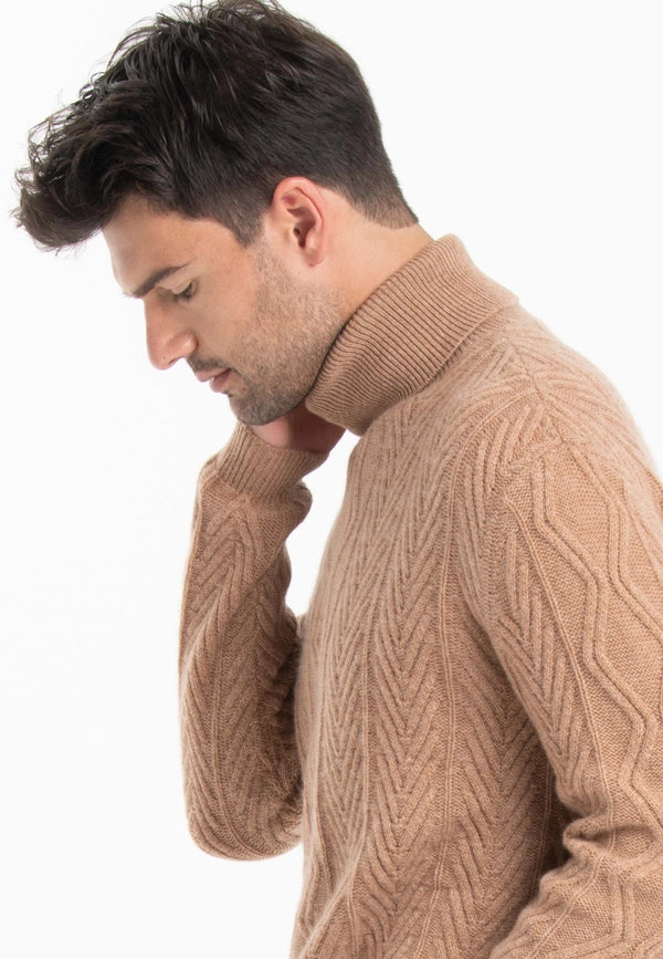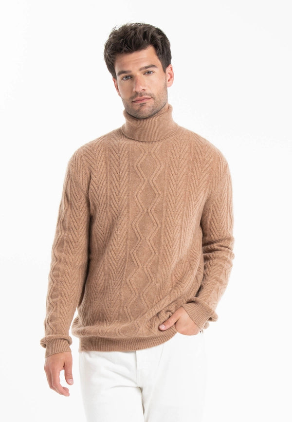 Enhance your winter wardrobe with the GABI 3 Camel Cashmere 4-ply Twisted Turtleneck Sweater. Crafted with a 4-thread cable knit, it offers a refined texture that complements its classic design. Made from premium cashmere, this sweater ensures exceptional softness and warmth. The elegant turtleneck provides added protection against cold weather, making it ideal for professional and casual settings. Available in multiple sizes, it combines sophistication with comfort for the discerning man.