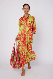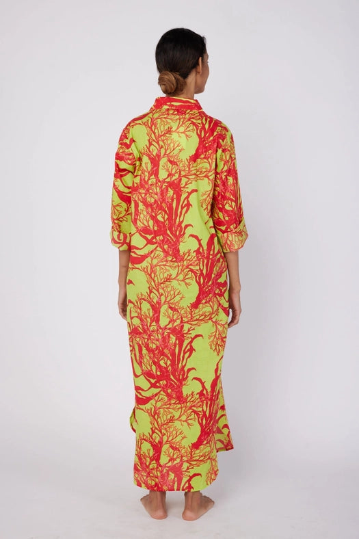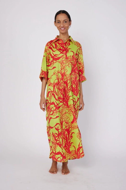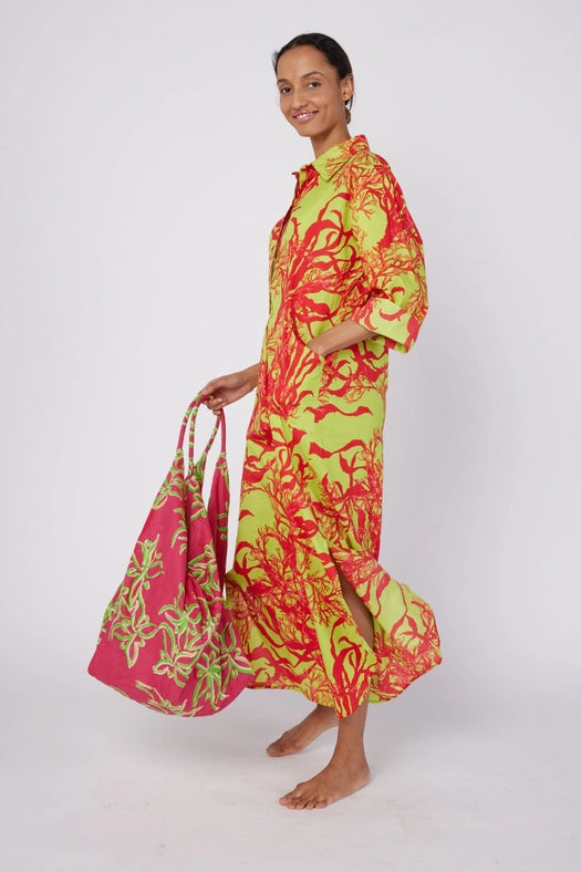 Introducing the Gabriella Resort Wear Summer Maxi Dress, the perfect blend of luxury and comfort. Made with breezy woven cotton, this dress features a bold green and coral print, a collar, and front pockets. Its subtle side slits offer unrestricted movement, making it ideal for leisurely strolls or special occasions. Made from 100% cotton and easy to care for, this dress exudes effortless style. Don't forget to complete the look with our Adra Lined Hobo Beach Bag and Fernanda Pareo Wrap Sarong in coordinating colors.