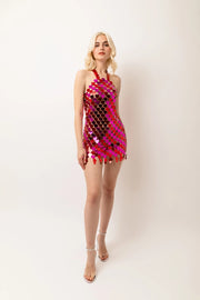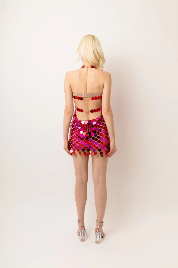 Elevate your party wardrobe with our Gigi Sequin Disc Halter Mini Dress. Adorned with shimmering heart shaped sequins, this dress is a true showstopper. The open back and rear chain fastenings add a touch of glamour. Made from 100% aluminum, this dress is also easy to care for with a simple hand wash.