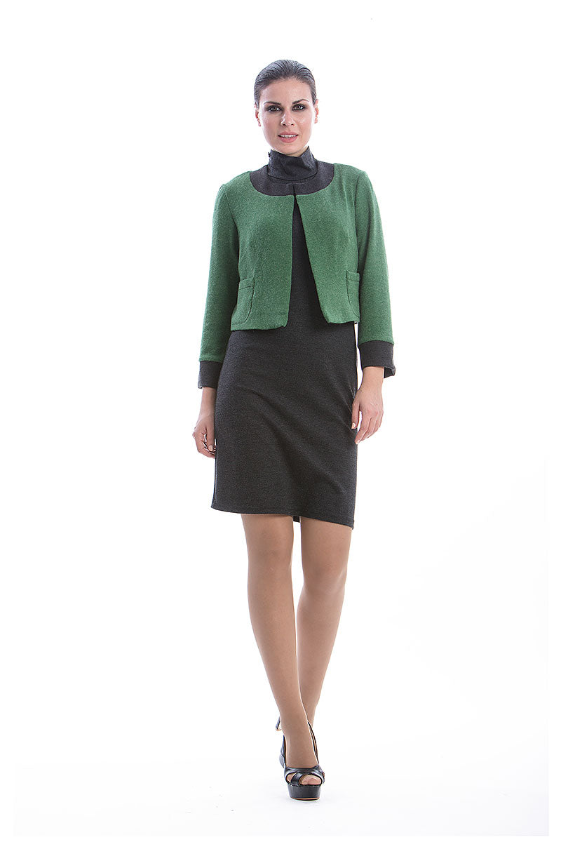 Bolero CONQUISTA in green knit fabric. Dark grey contrast fabric on the front pockets, cuffs and neckline. Long sleeves and open in the front. To the waist in length. Stretch polyester lining. The model is 1.77m and is wearing size 36/S. 49%viscose-34%acryl-11%wool-4%cashmere-2%elastan.