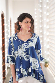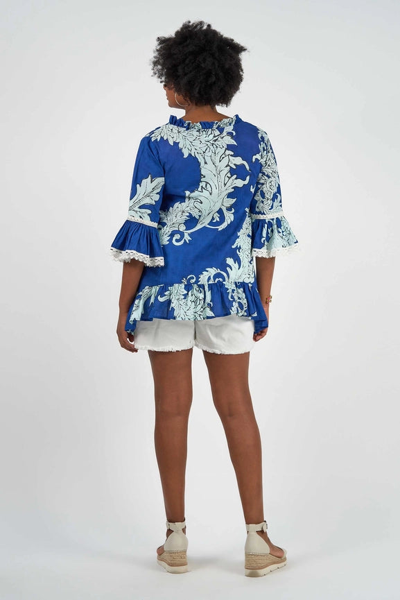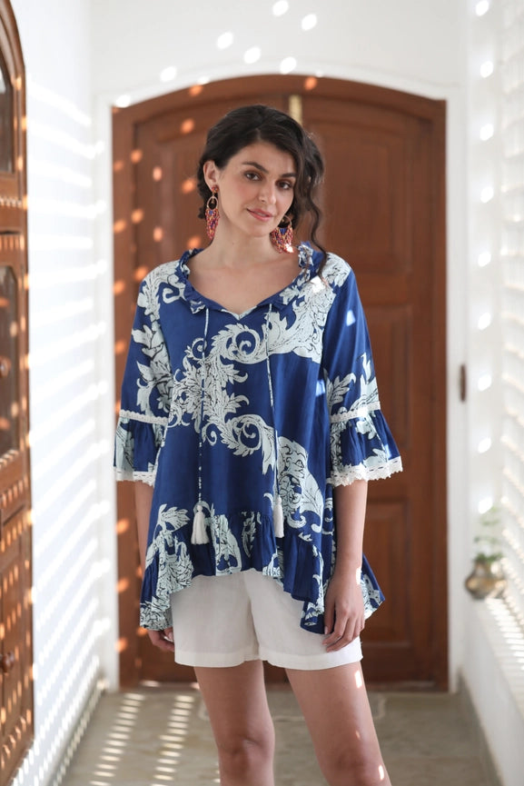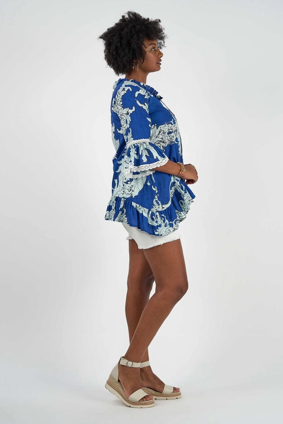 Transform into a baroque beauty with our Hacienda Tunic in Pompeii Print. Made with luxurious 100% cotton, this tunic features exquisite ivory lace trims, frilled 3/4 sleeves, and a ruffled neck and hemline. With its relaxed and free flowing fit, it's perfect for any occasion. Plus, its matching tassels add a touch of flair. Cold machine wash recommended.