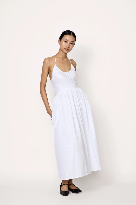 Experience effortless elegance with our Halter Midi Dress in crisp white. Designed for both style and comfort, this dress features delicate halter straps and double elastic shirring for a flattering fit. Crafted from soft organic cotton poplin with practical side pockets. Made in India with sustainable and ethical practices.
