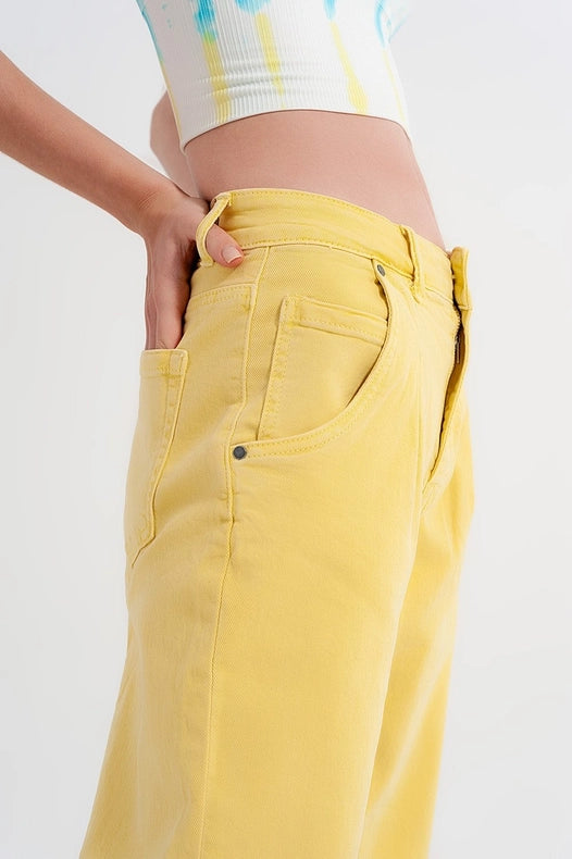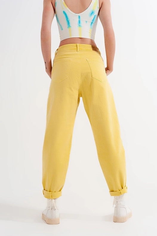 Elevate your style with our High Rise Mom Jeans. These yellow jeans feature a pleated waistband and cuffs, along with five pockets and belt loops. The fly front zipper ensures a secure fit. Made of a comfortable and durable blend of cotton, polyester, and elastane.