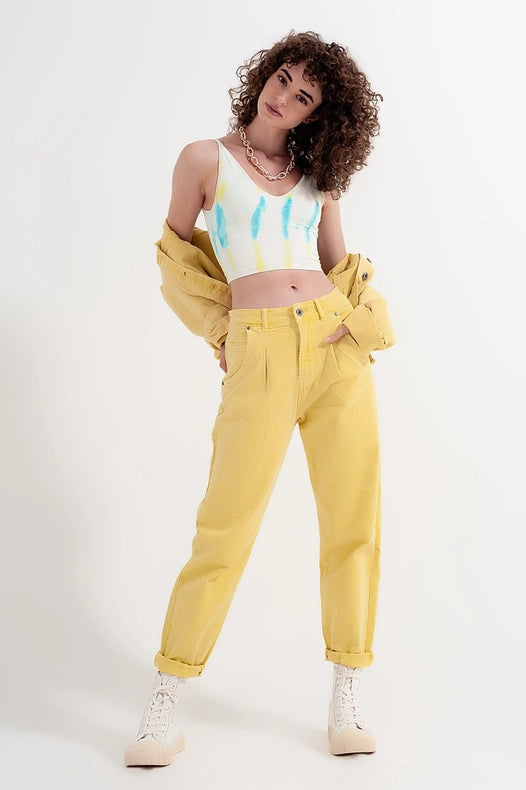 High Rise Mom Jeans With Pleat Front In Yellow