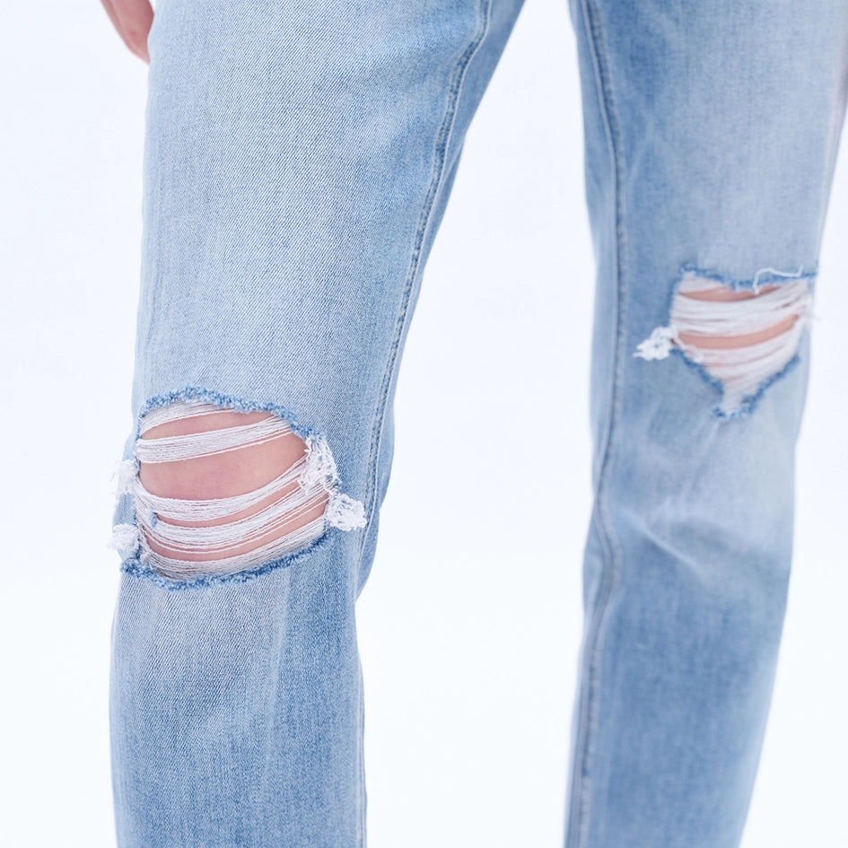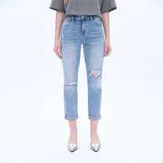 Discover the perfect blend of comfort and style with our High Rise Relaxed Boyfriend Jeans. Crafted from comfort stretch denim, these jeans feature a high rise waist for a flattering fit. The medium blue wash adds a touch of Southern charm, while the distressed hole design and rolled hem give them a trendy edge. Plus, with machine wash care instructions, these jeans are both easy to wear and care for. Perfect for spring and summer, these jeans are a must-have for any fashion-forward wardrobe.